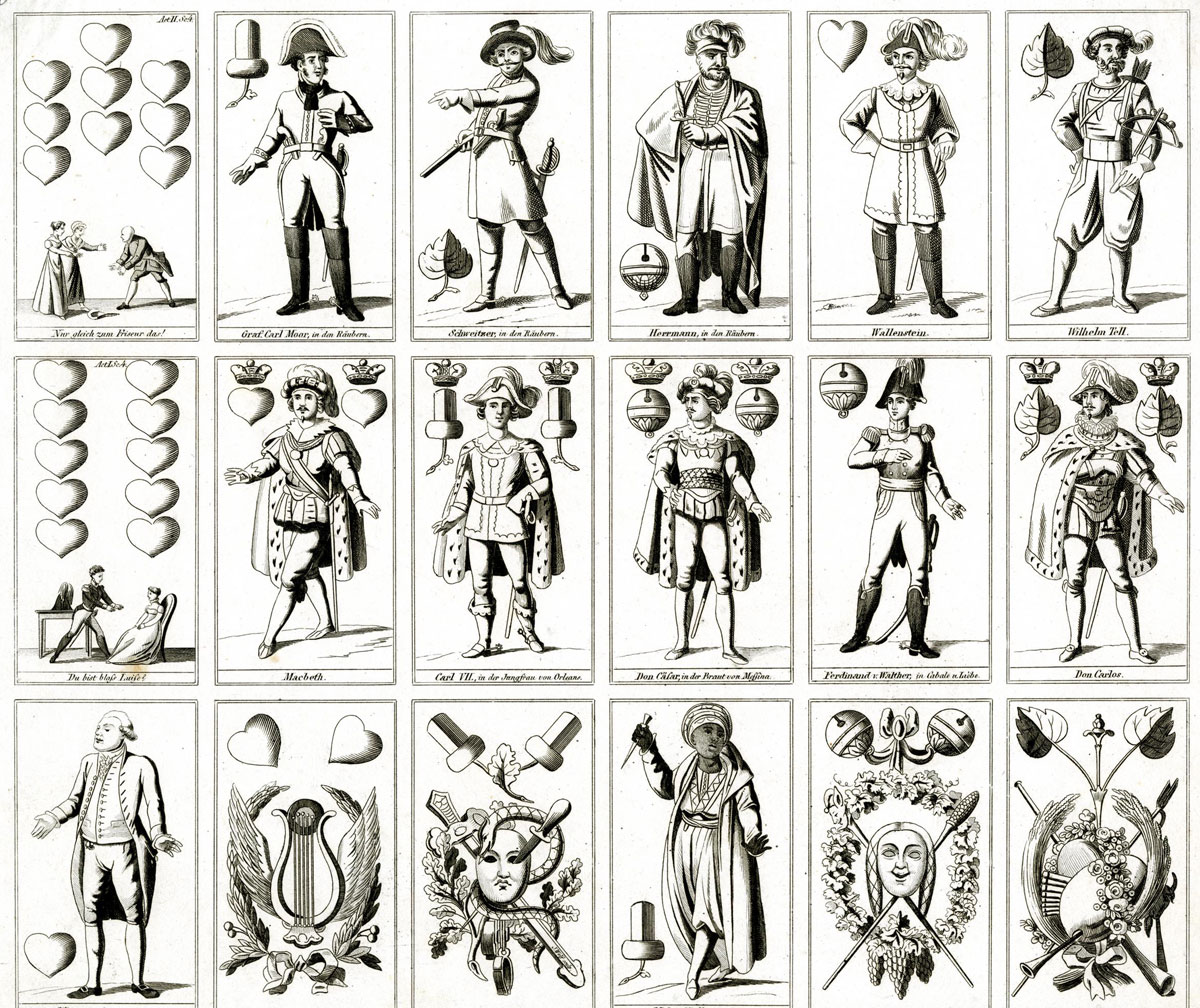 Above: an uncut sheet with 18 playing-cards with German suit-marks showing scenes and characters from different plays, some associated with German playwright Friedrich Schiller (1759-1805). The cards are the 4 aces, 4 knaves, 4 knights, 4 kings, and the 9 and 10 of hearts. Each pip card has the act and scene number in the top right corner and a description of the scene on the lower margin. The court cards have the name of the character in the lower margin. The partner to this sheet (no. 1883,1110.129) has on the 8 of hearts a stone monument with the name of "Schiller" printed in the centre. Below is "C.L. Wüst in Frankfurt a/m." © The Trustees of the British Museum • Museum number 1883,1110.126►