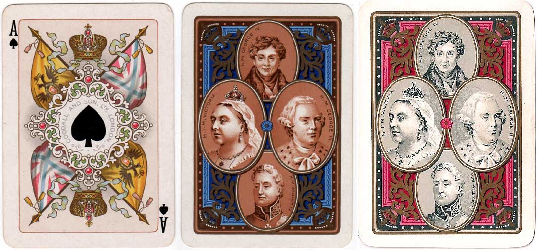 A magnificent example of Goodall & Son's range of chromolithographed commemorative playing cards from the late nineteenth century, the four Aces in this “Nineteenth Century” pack show the flags of Russia, France, Germany and Italy. The court cards feature monarchs and statesmen from those countries whilst the back design has medallion portraits of George III, George IV, William IV and Queen Victoria.