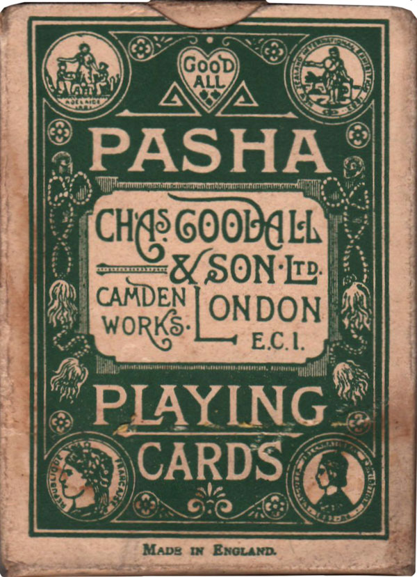 “Pasha” is one of Charles Goodall & Son’s brands which first appeared in c.1898 and was retained until after the De la Rue takeover in 1921. The artwork on the box is very decorative and features gold medals along with the words “Pasha Playing Cards” and “Made in England” and “Duplex Round Corners” along the sides