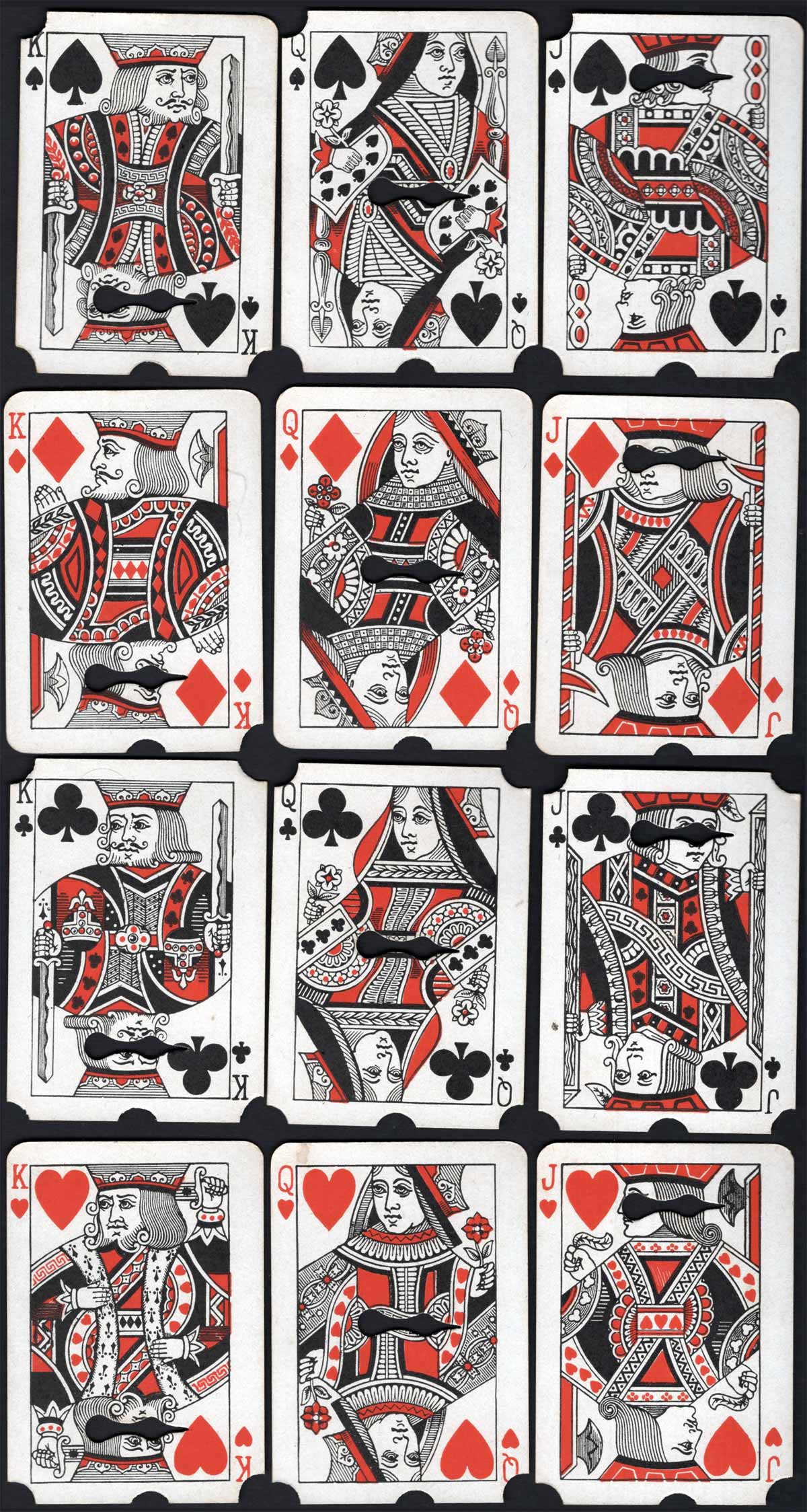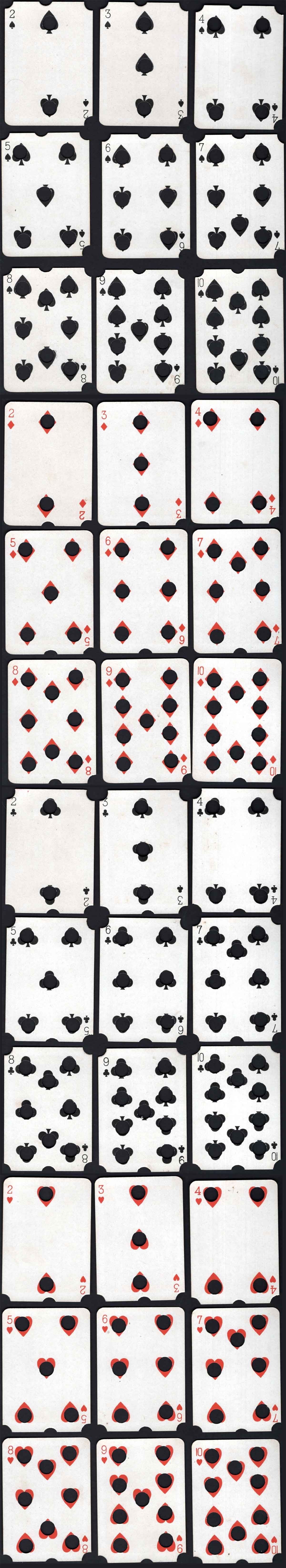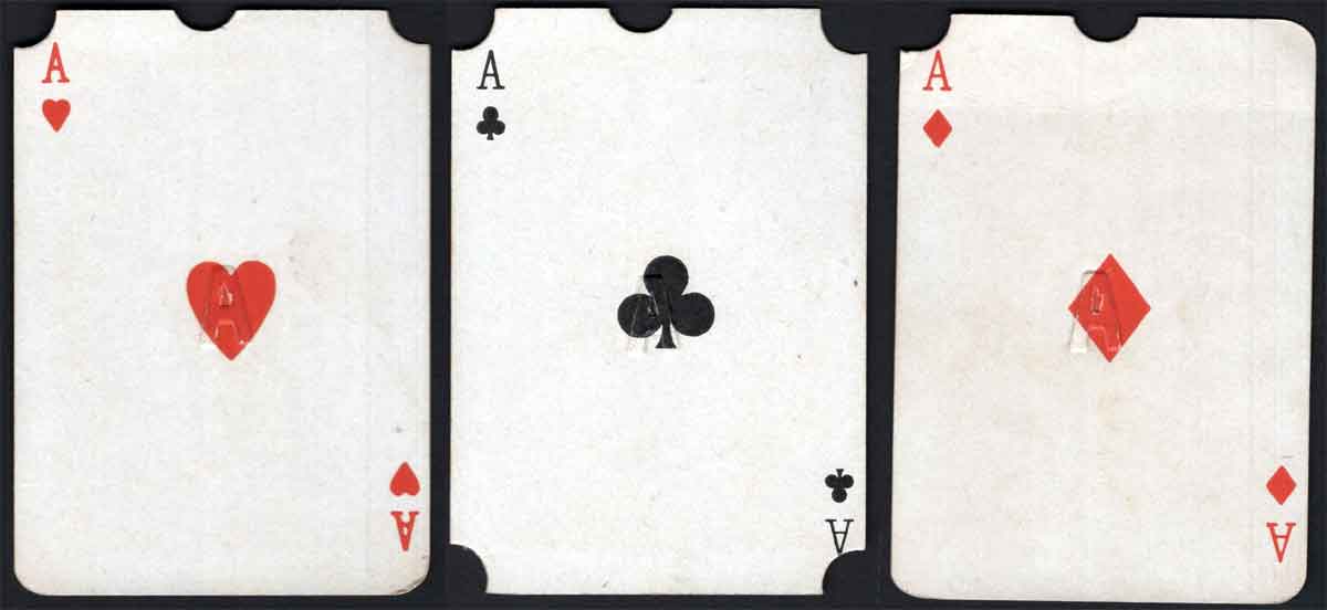 An interesting pack by Goodall & Son designed for blind people, I’d date them c1910. Each ace card has a raised ‘A’ in the centre, and each suit has specific clipped corners : Diamonds - 1; Hearts - 2; Spades - 3; Clubs - 4. All the pip suit symbols have a circular punch hole but only the Joker has no punch holes or clips. The court cards are printed in red / black only. The cards don't appear to be using the standard Braille system (invented in 1824 by Louis Braille) but another one. Definitely suitable to allow blind people to participate in most card games, such as cribbage, etc. except, perhaps, that sighted players may gain an advantage seeing the opponent's clipped cards, and body language cannot be observed • See the box