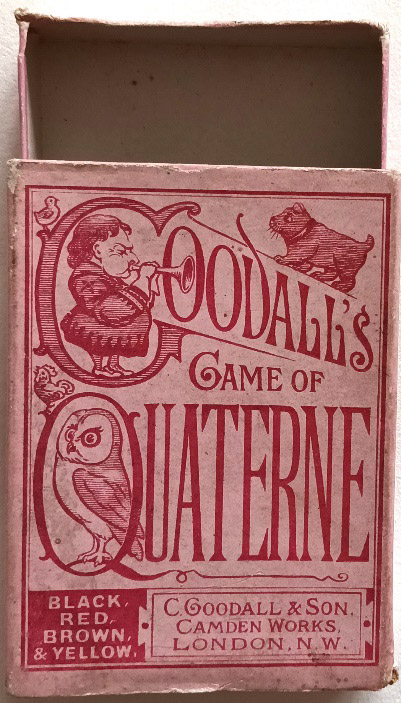 However, what do we know? Quaterne was one of a series of games with this title first published by Goodall & Sons in 1873. My box contains a mixture of cards from at least three different versions of this game. The games were mass produced for children, and the quality of the cards was poor by comparison with other Goodall products. The Quaterne box, unlike playing card containers, opens like a match box .