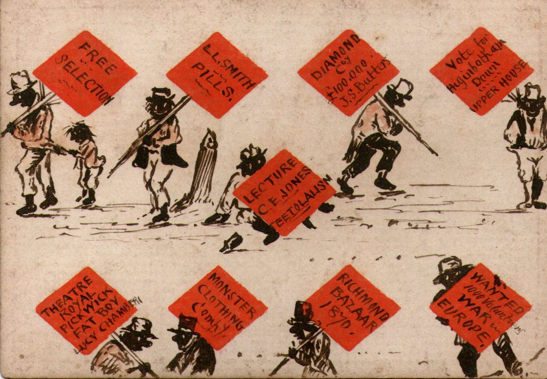 On the other hand, some of the placards on the nine of diamonds , such as “Mr. J. S. Butters” (1833-1912), “Free Selection”, “Vote for Higinbotham” and the “War in Europe” probably refer to Australian news issues of the day. The “Theatre Royal”, although not an uncommon name for a theatre, also fits with the Australian theme.