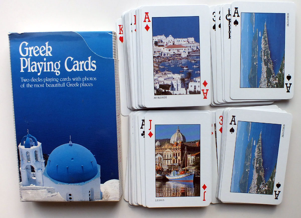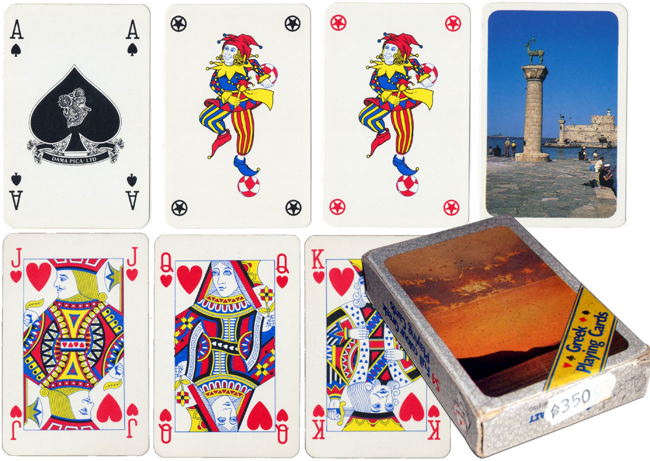 Greek Souvenir playing cards are produced in various styles, ranging from colour photos of Greek scenery to photos of artefacts in museums celebrating ancient Greek civilisation. Some editions of "Greek Playing Cards" are a standard English pattern with a cheerful colour photo of a Greek Island on the reverse, made by a local manufacturer such as Dama Pica Ltd. see example here►. Advertising decks for Greek shipping lines or other businesses are often produced by foreign manufacturers rather than national ones.
