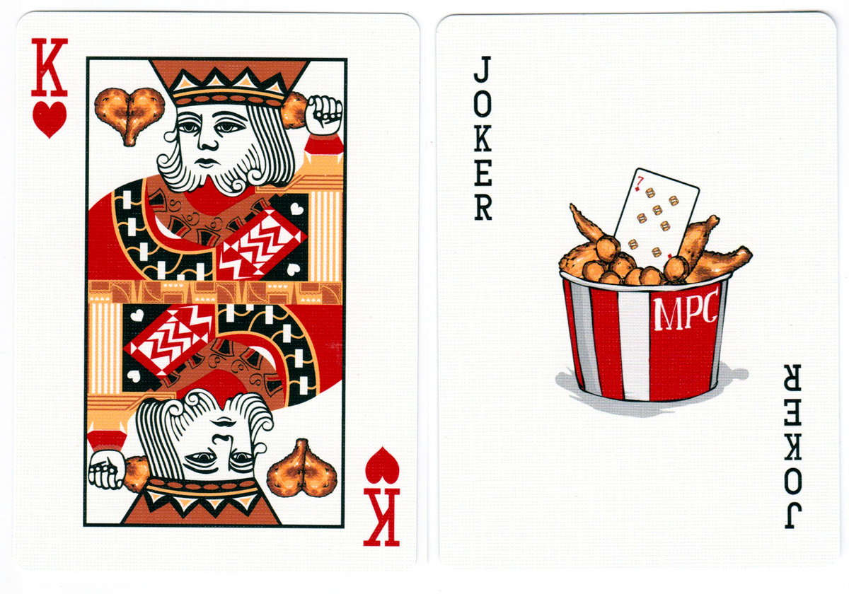 The card designs feature fried chicken elements, replacing traditional pips with four popular chicken pieces - wings, drumsticks, thighs and nuggets. The court cards show kings, queens, and jacks holding chicken pieces. The tuck box, crafted from 100% recycled paper, carries the scent as well. Both jokers show fried chicken buckets, also incorporating the deck's theme.