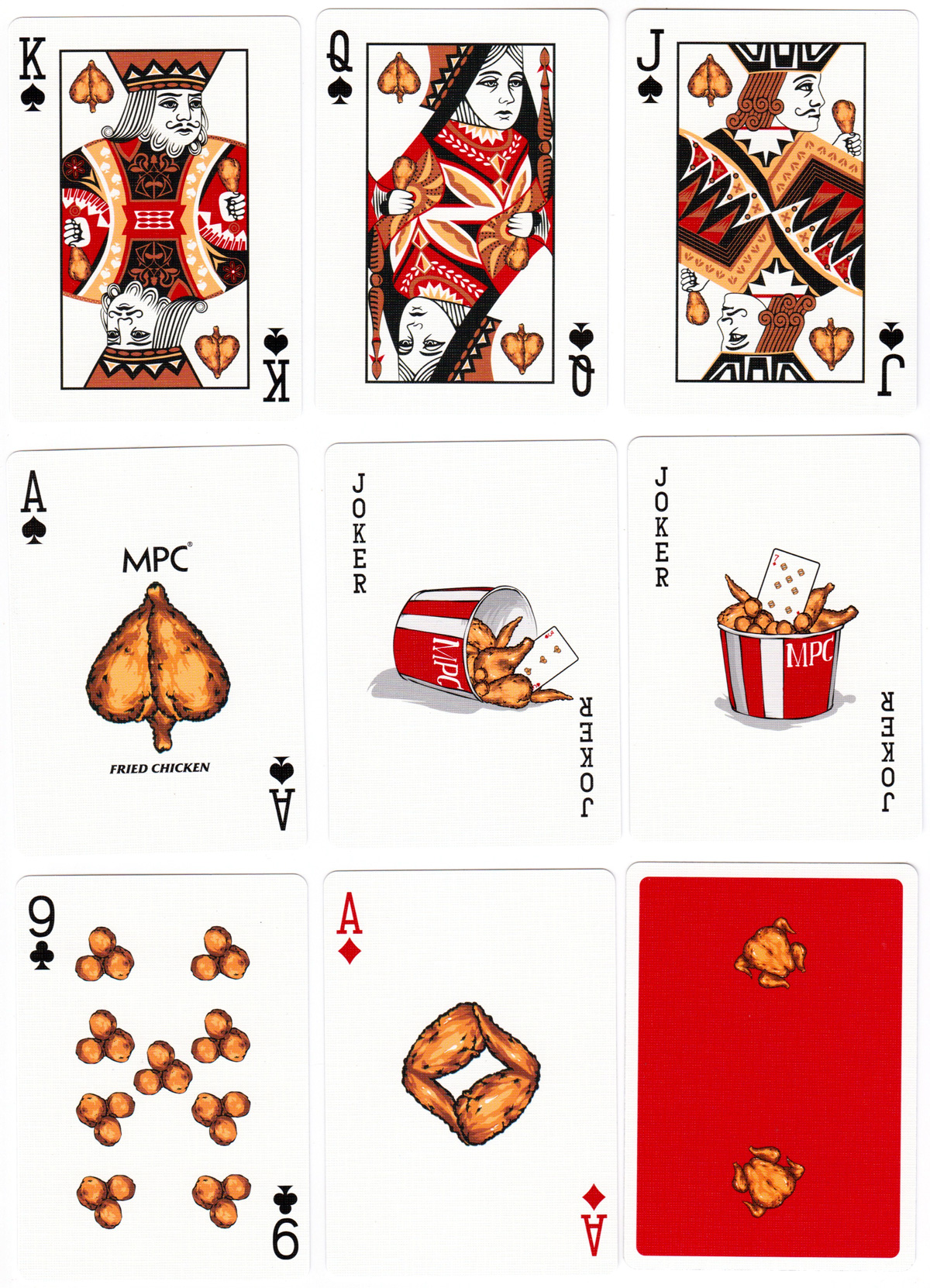 Fried Chicken Scented Playing Cards by MakePlayingCards.com (MPC) provide a distinctive sensory experience by incorporating the smell of fried chicken into a deck of playing cards. According to MPC, the cards contain soy-based microcapsules with fried chicken fragrant essence oil, which release the scent when handled. I found the fragrance is potent and easily transfers onto hands and surfaces.