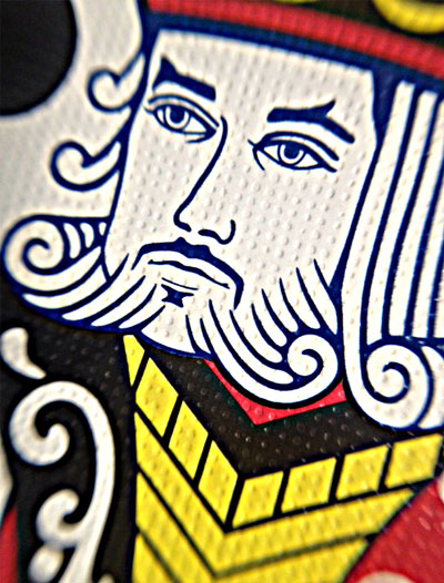 Above: Legends Playing Cards produced by a new card factory in Taipei (Click image to zoom). The courts are standard other than the King and Queen of Spades: the King is Lawrence Sullivan himself, the queen a close friend! The back design looks very clean from a distance, but it has many hidden features. Card stock is ultra-thin, yet stiff and of good weight. Printing registration is sharp and bold and the backs have thin borders, evenly cut. The card surface is embossed with tiny dimples creating excellent handling qualities. The finishing coat is smooth, but less slippery than standard brands, and adapts to your card-handling style.