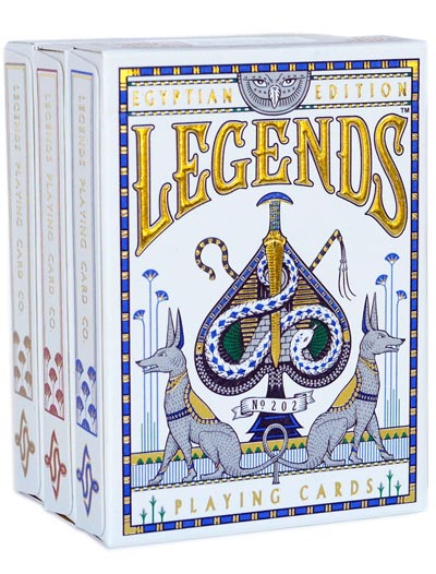 Above: Legends No.202 Egyptian Edition, featuring the best packaging design ever seen on a deck of cards, in a choice of three colour schemes. A custom die cut tuck box, lustrous mirror-like interior foil, and for the first time ever on a tuck case, stunning 3D foiling and embossing on our hallmark. These features, coupled with ultra precise two tone printing, which emphasises the Egyptian theme and showcases Mark Stutzman's brilliant illustration, make this deck fit for a pharaoh.