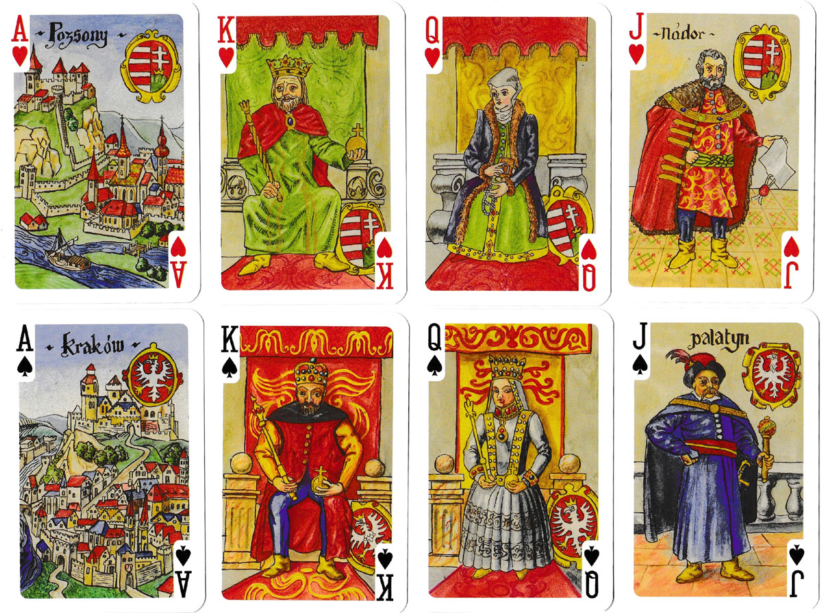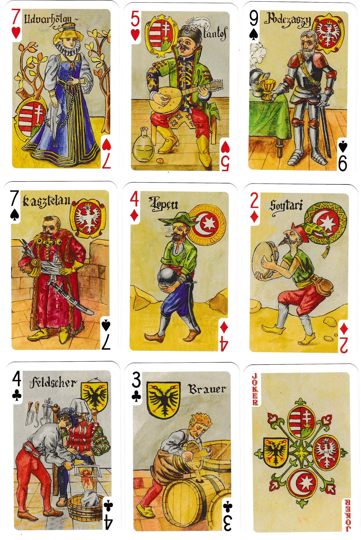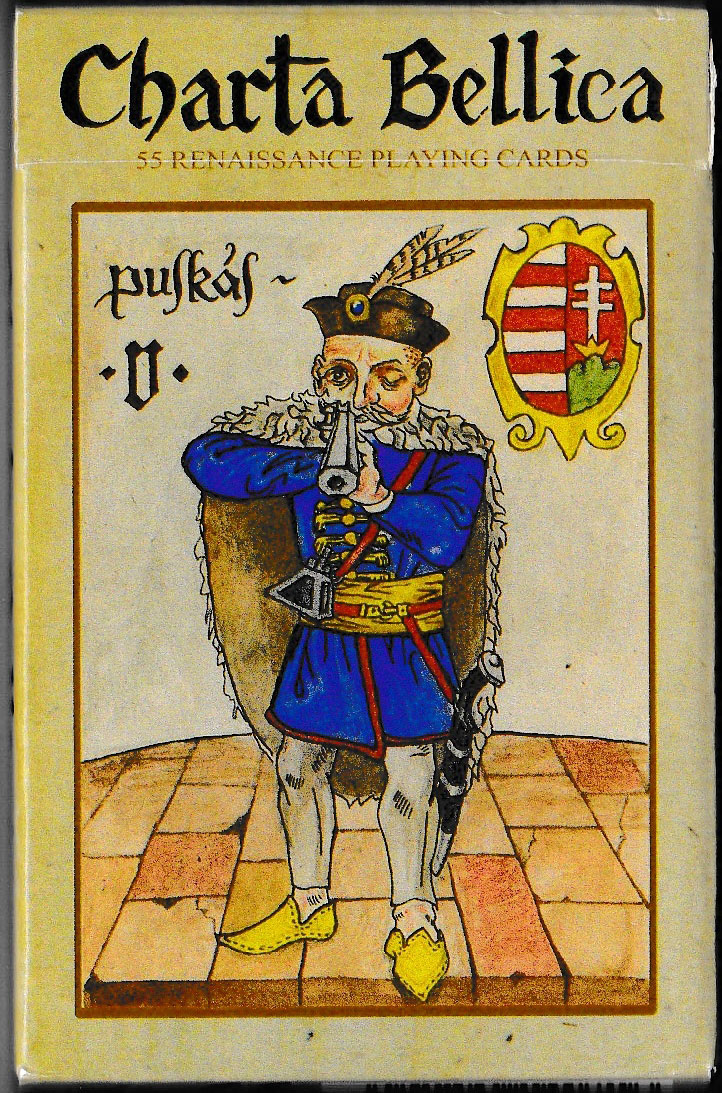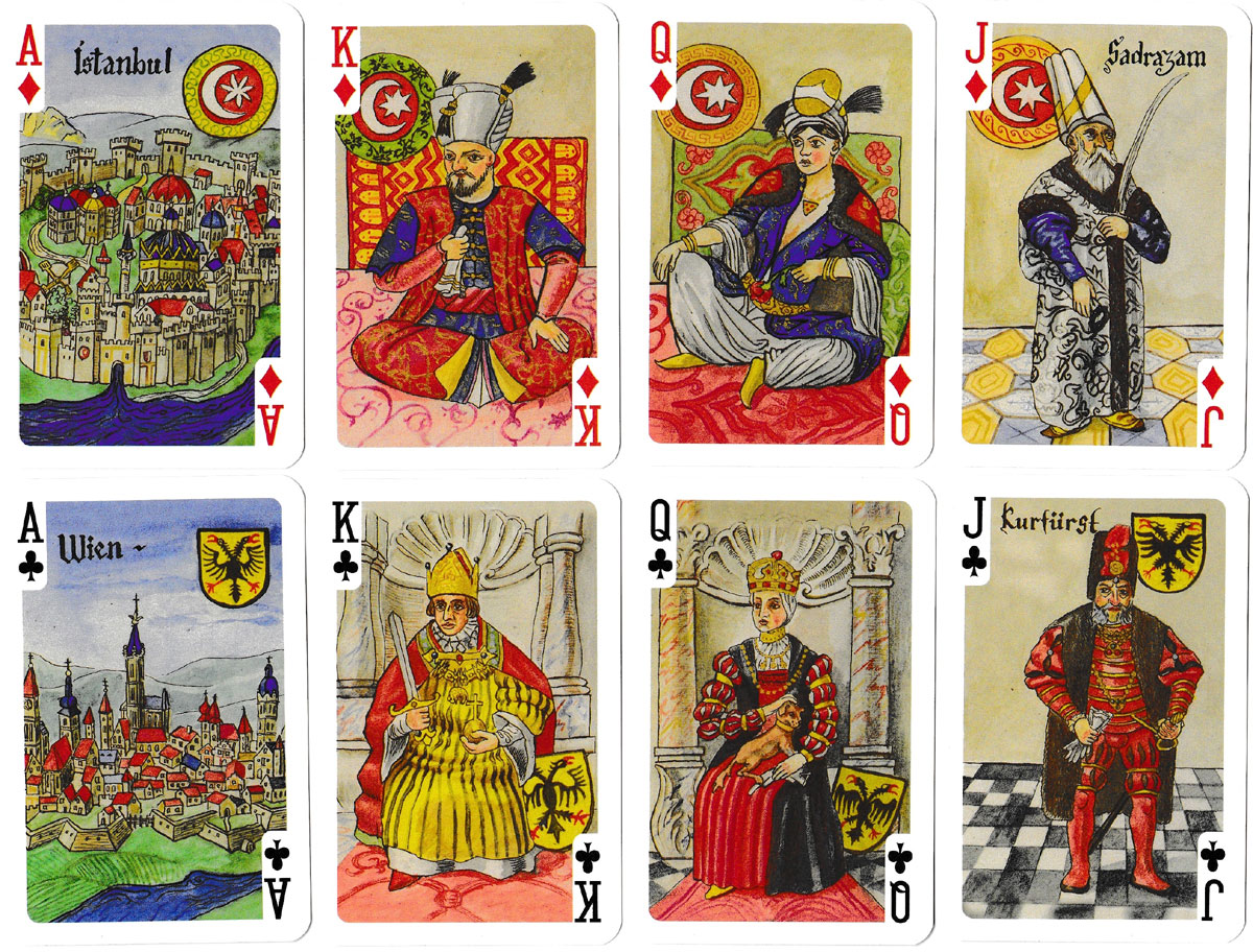 This pack entitled Charta Bellica (from the Latin meaning “War Playing Cards”) was produced by Piatnik, Budapest in 2009. It consists of 52 cards, 2 jokers and an information card. The four suits represent the four nations of Hungary (hearts), Poland (spades), Turkey (diamonds) and Austria (clubs), with each card of the suit incorporating the appropriate coat-of-arms. The aces depict the four capitals: Pozsony (former capital of Hungary, now Bratislava), Krakow, Istanbul and Wien. The remaining cards portray late 16th century court officials, soldiers or citizens based on contemporary prints, cuts and paintings. The cards were painted by Márton Somogyi (1979- ). See the box►