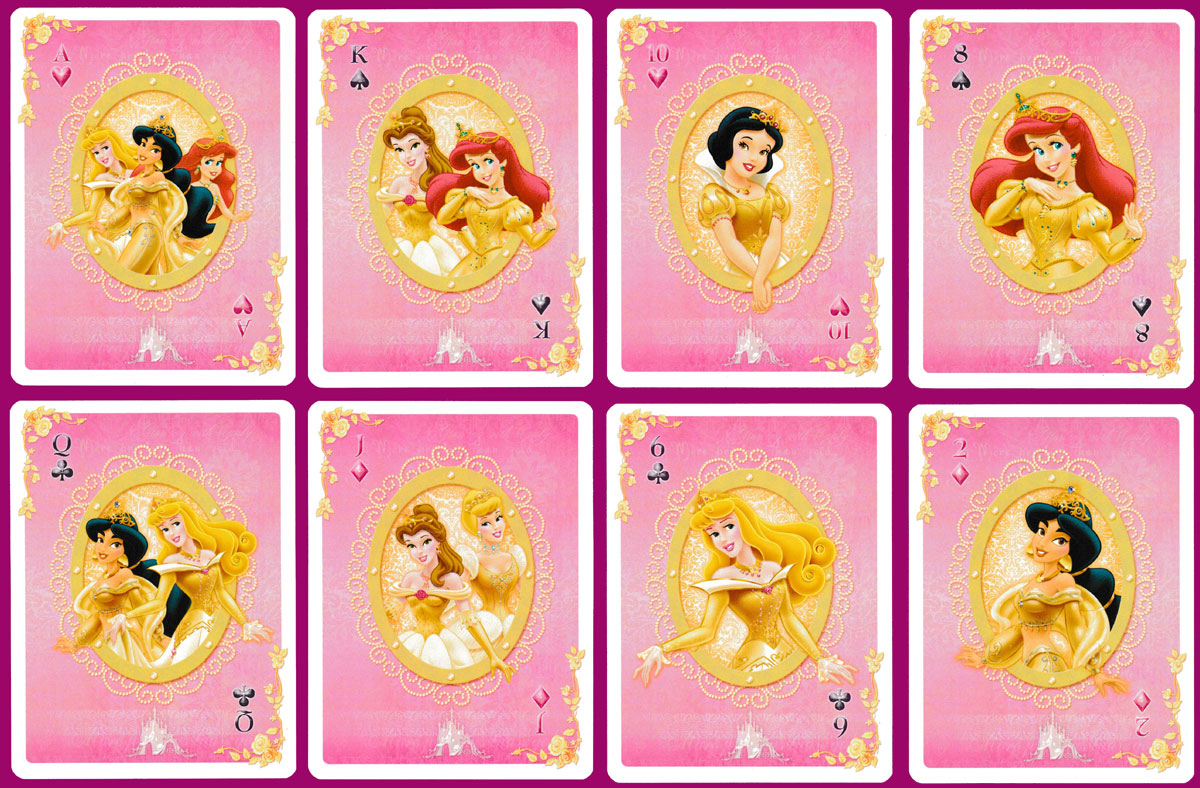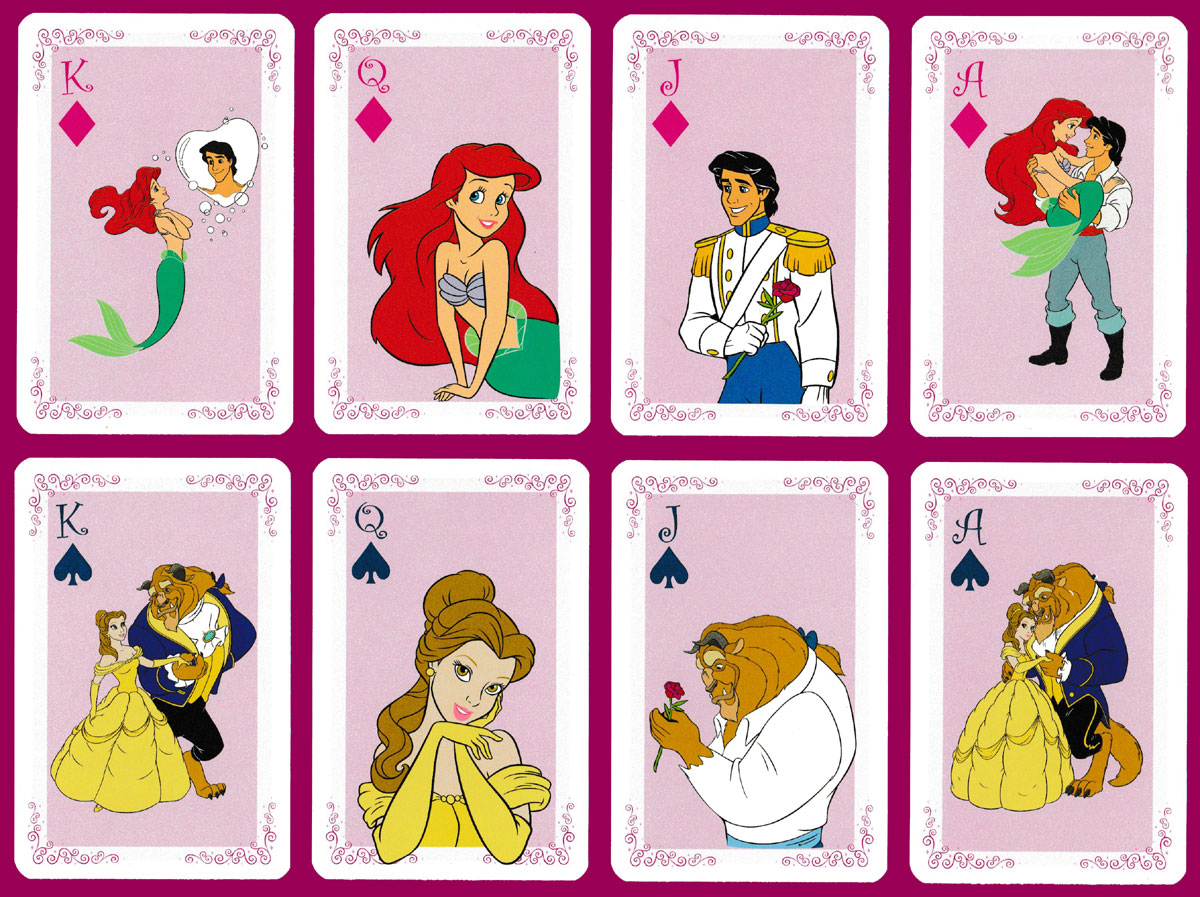 Each suit corresponds to a different Disney Princess: Snow White (H), Cinderella (C), Ariel (D), Belle (S). Every card is illustrated (with repetition on the 3 and 8 of Clubs). The background colour is a strong pink on the court cards and Aces and a pale pink on the numeral cards. The indices appear only once on each card. See the box►