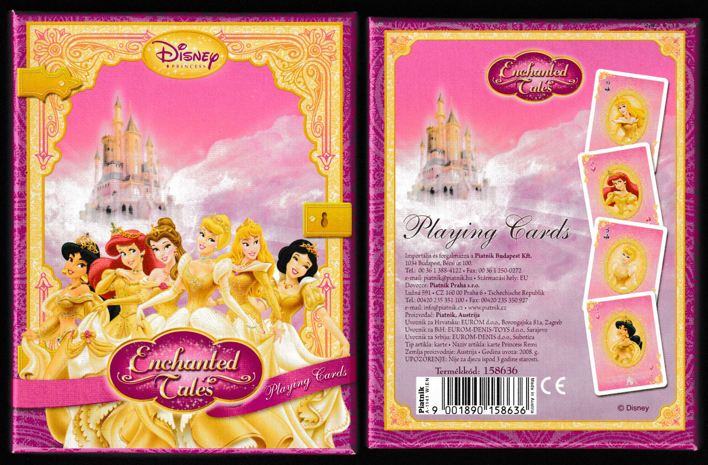 Above: Disney Princess (large) made by Piatnik, Vienna, Austria, for Piatnik Budapest and Piatnik Praha, c2009. 52 cards + 2 (identical) Jokers + 2 extra (double-sided) cards with text in Hungarian, Czech, Slovak, Slovenian, Bosnian/Croatian and Serbian, in drop-lid box. Piatnik No. 158636. Size: 89 x 119 mm. © Disney