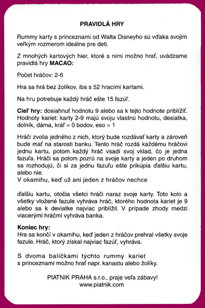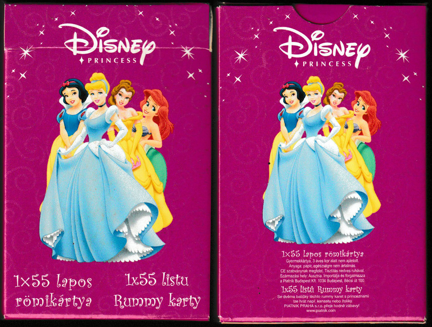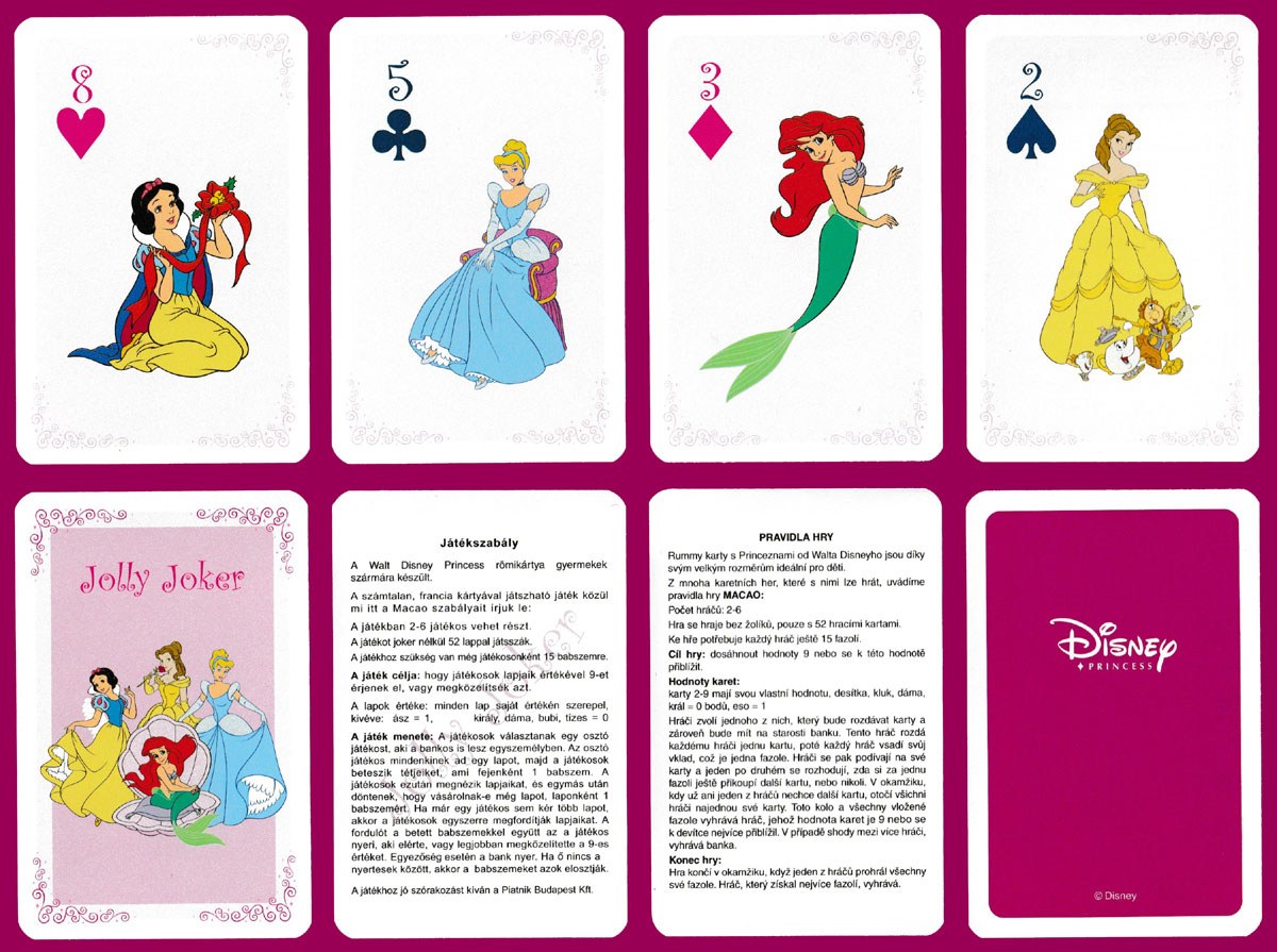 Above: Disney Princess (small or normal size) made by Piatnik, Vienna, Austria, for Piatnik Budapest and Piatnik Praha, c2009. 52 cards + 1 Joker + 2 extra cards (one of which can be used as an extra Joker) with text in Hungarian and Czech, in tuck box. Piatnik No. 159114. Size: 58.5 x 88.5 mm. © Disney