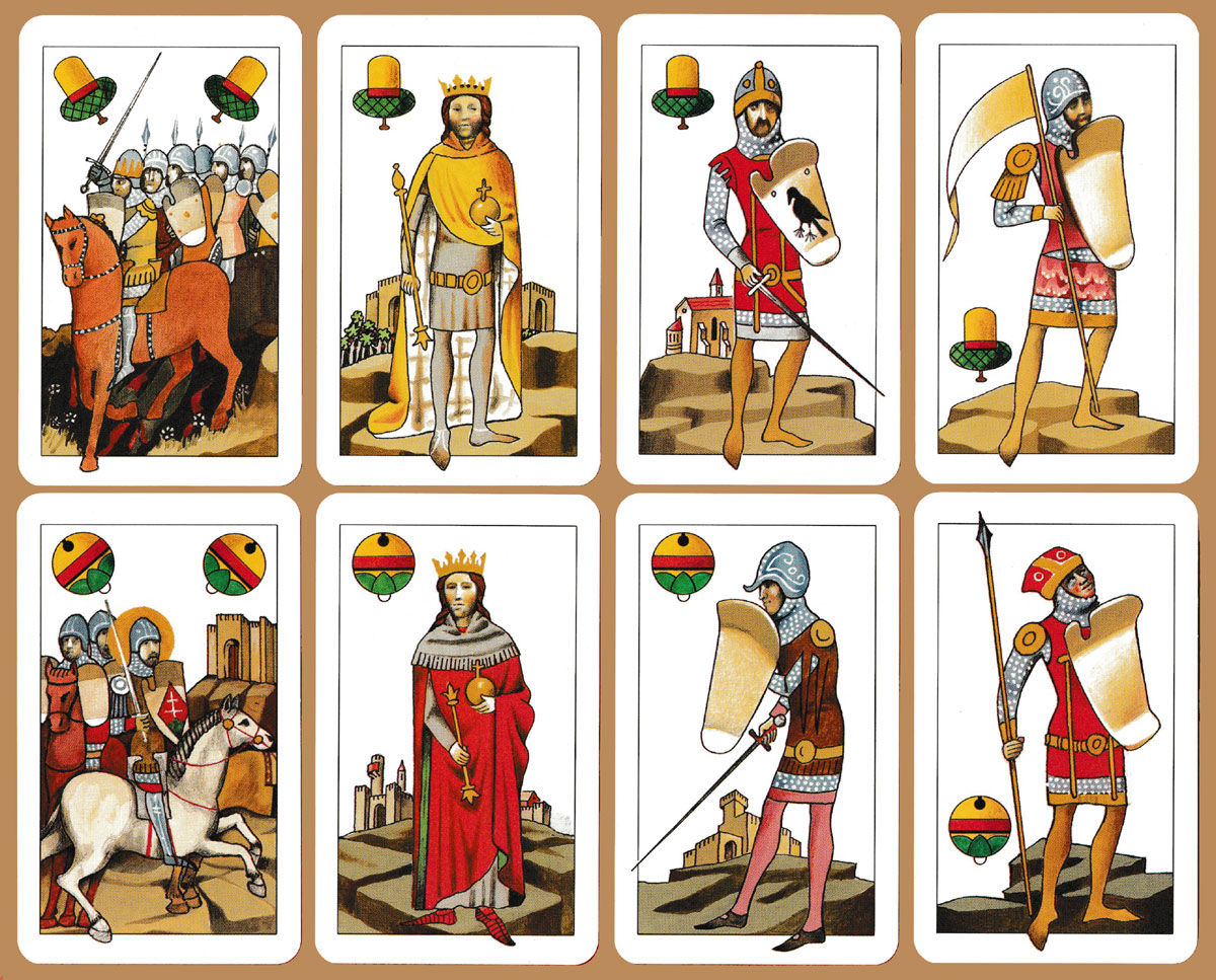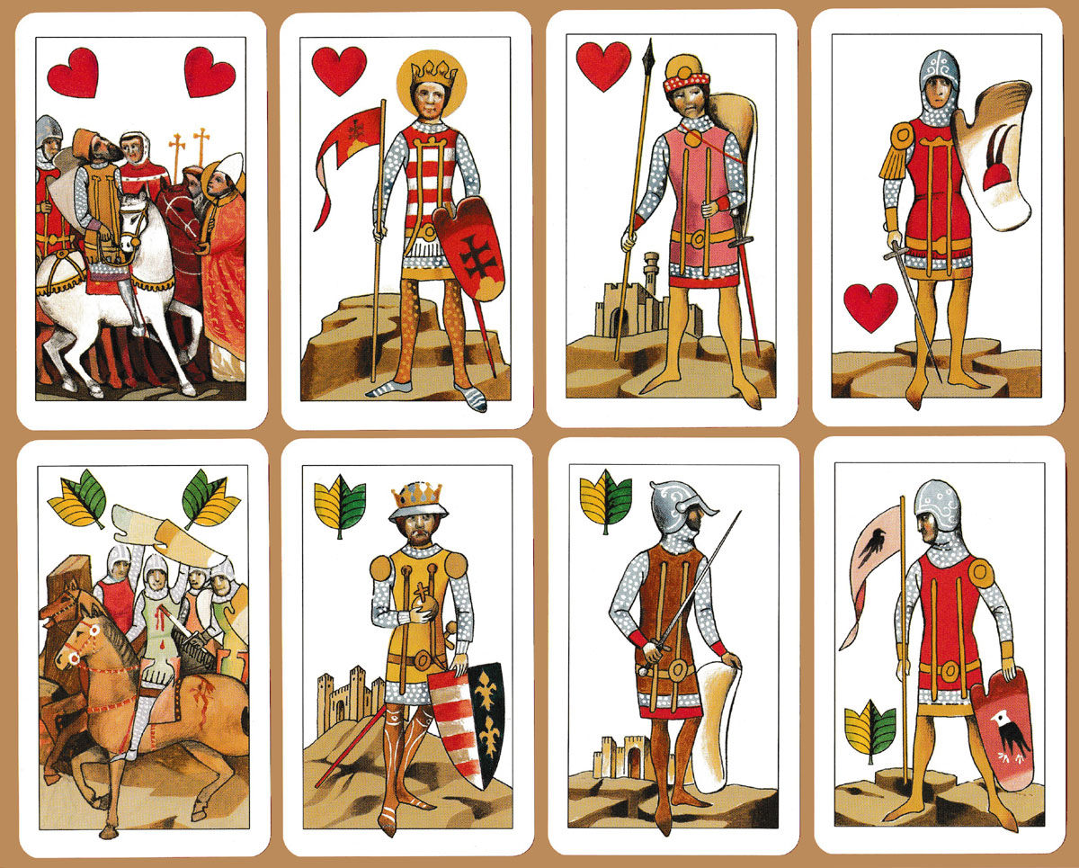 Courts in medieval costume holding both French and Italian/Spanish suit-signs.