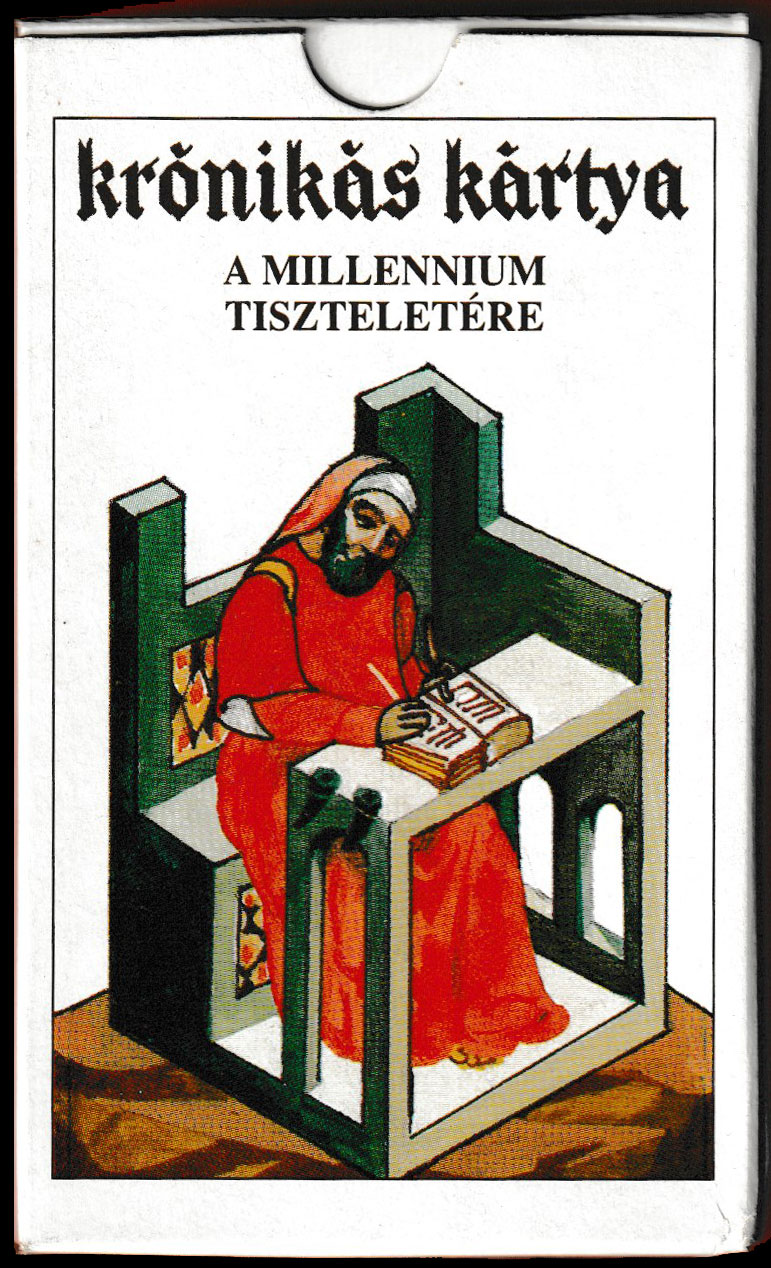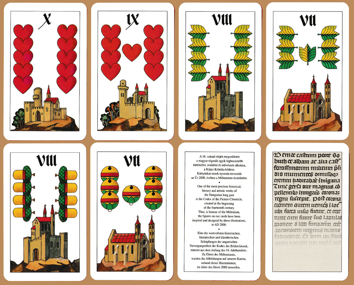 The Képes Krónika kódexe (or Codex of the Picture Chronicle) is considered to be the most important Hungarian illustrated historical text from the 14th century. It was prepared around 1360 on the orders of King Louis the Great and is now preserved in the National Széchényi Library in Budapest. The chronicle was the inspiration for the designs used in this German-suited pack, issued in honour of the millennium. The vignettes of castles and churches on the pip cards are repeated in each suit. The back design is made up of Latin text, the chronicle having been written in Latin. There is no information about the designer, printer or publisher of this pack. See the box►