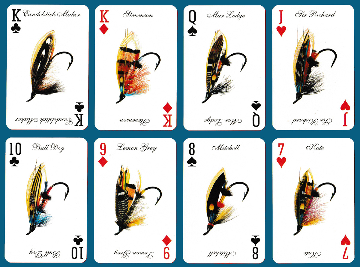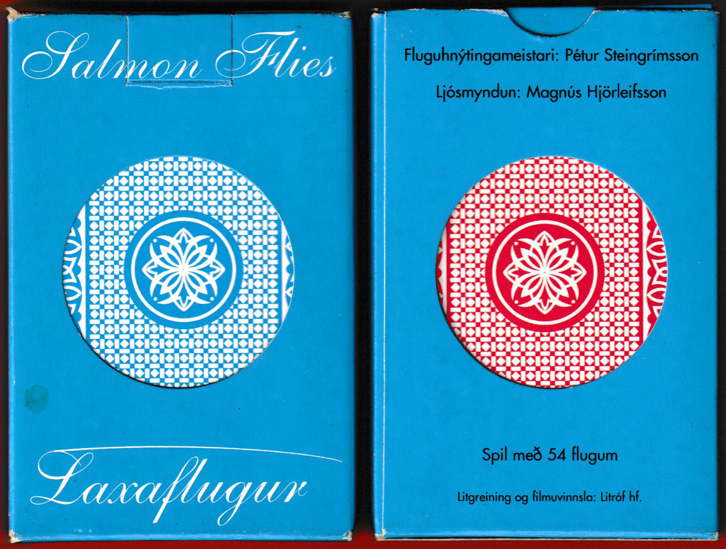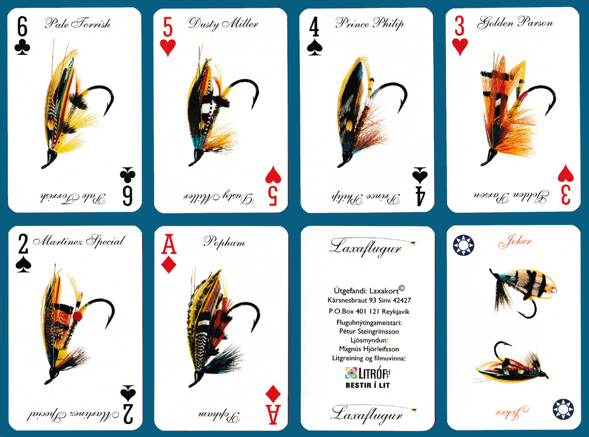 Above: Salmon Flies playing cards published by Laxakort hf, Reykjavik, Iceland, c1996. Printed by Piatnik, Vienna, Austria. 52 cards + 2 (identical) Jokers + 1 extra card in tuck box. Size: 58 x 89 mm.