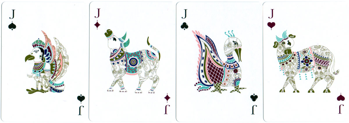 The basis of the Indian world view is of Cosmic unity underlying the physical diversity of the world, through which man transcends himself. Since almost every Indian folk art form is based on Hindu mythology, the jacks, queens and kings of each suit depict various Gods and Goddesses as well as their mounts (vahanas/vehicles). The coherent colour palette also has an underlying symbolic meaning.