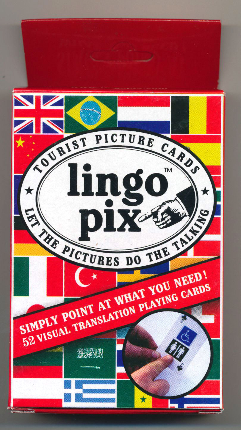 Lingo Pix Tourist Picture Cards by TM Cards, India, 2006. The four suits carry pictures related to different topics: spades = places; hearts = food and drink; clubs = miscellaneous and diamonds = essentials while the two jokers carry key phrases in ten major languages. See the Box►