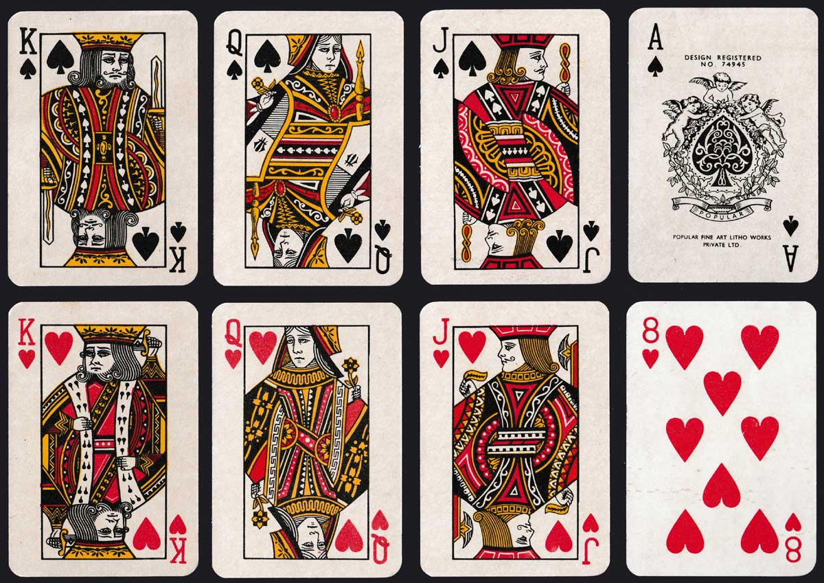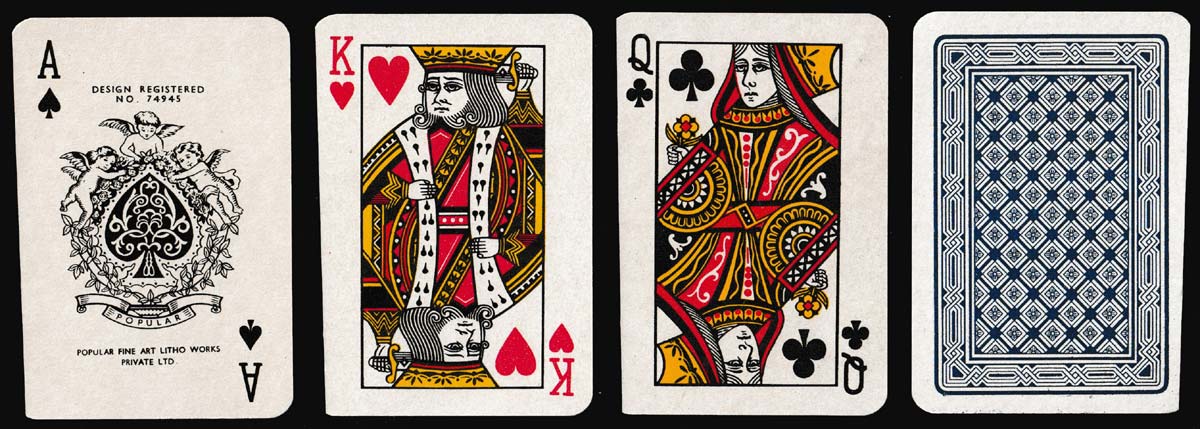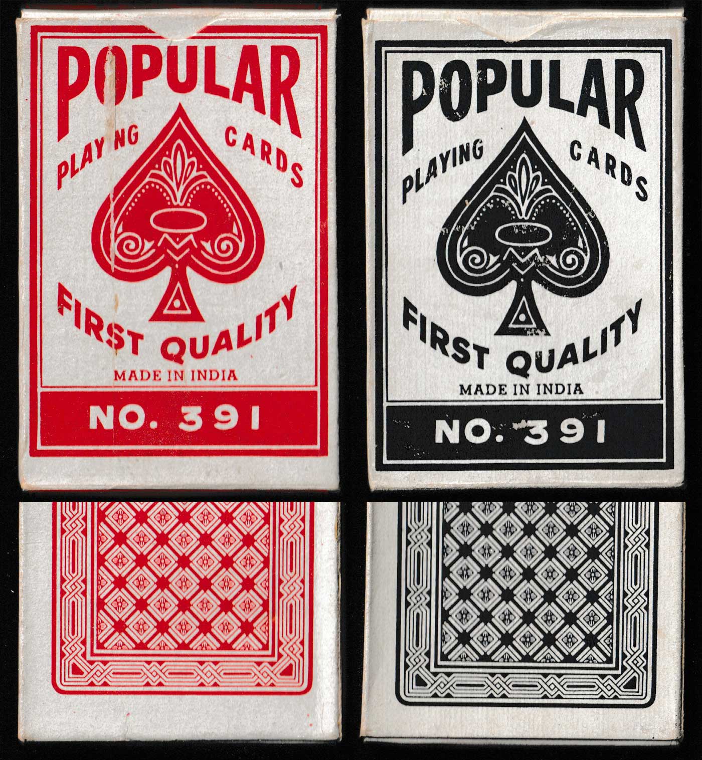 Above: Popular Playing Cards No. 391 made by the Popular Fine Art Litho Works Private Ltd., Bombay, India, c1970. 52 cards + 2 Jokers in tuck box. Size: 59.5 x 86 mm.