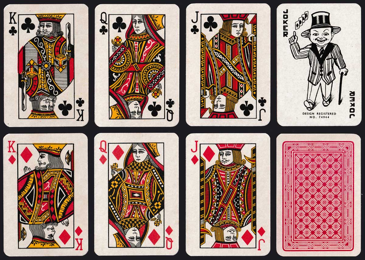 English pattern courts going under the brand name of “Popular Playing Cards No. 391”. Indices in two corners only. Two of the designs have been registered, the Joker (no. 74944) and the Ace of Spades (no. 74945). Blue or red patterned backs. See the box►