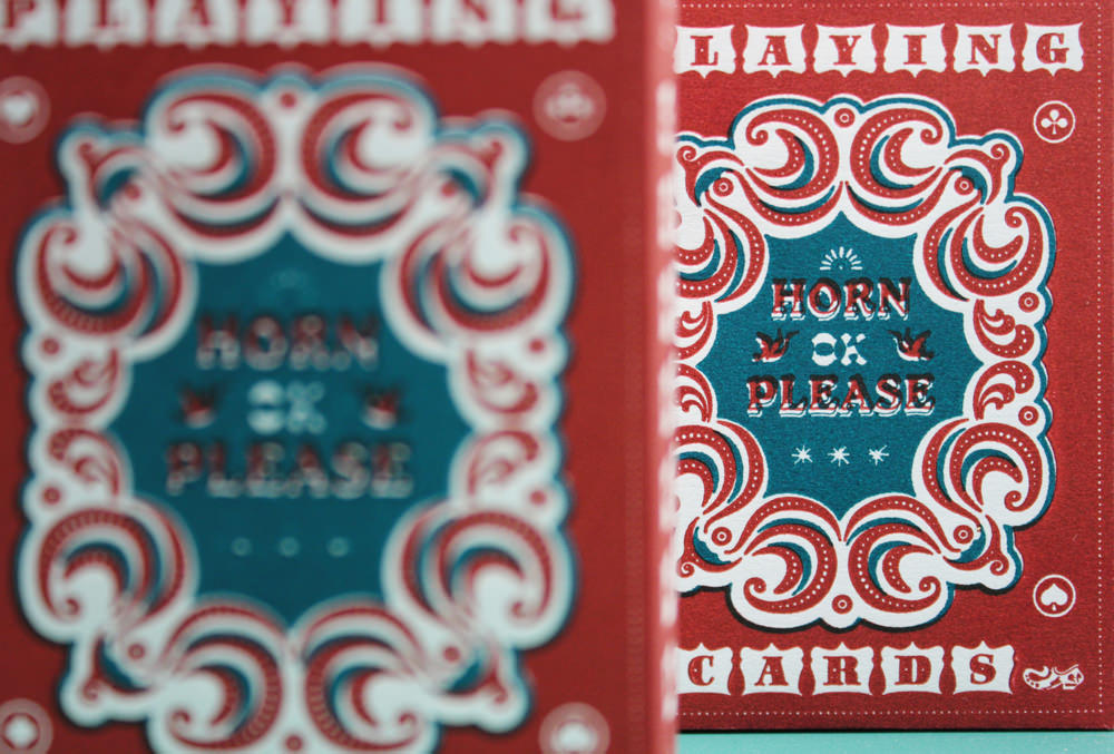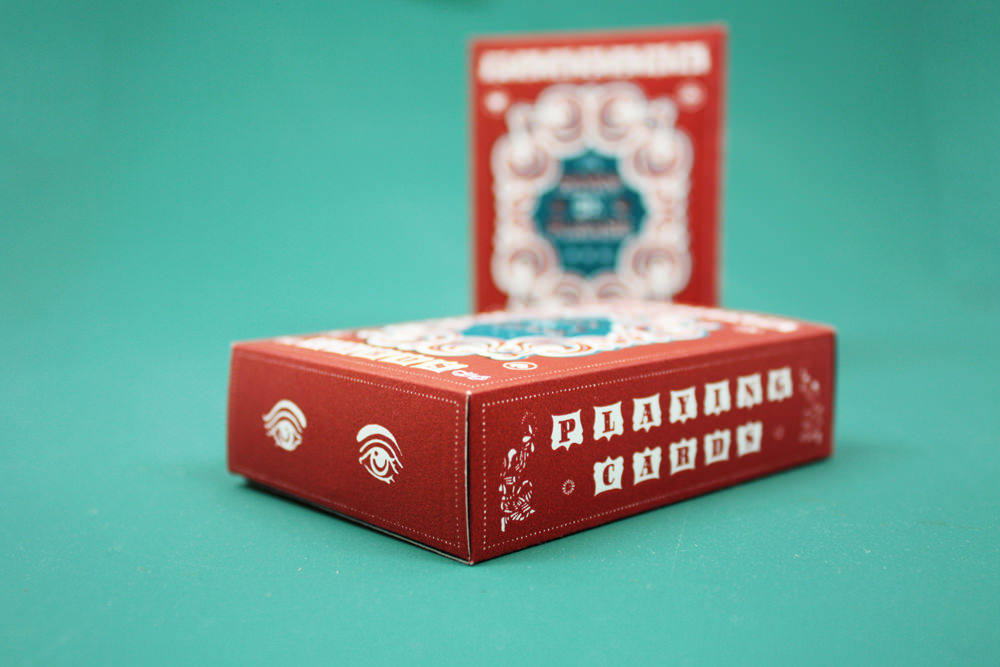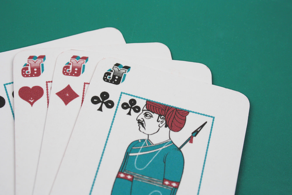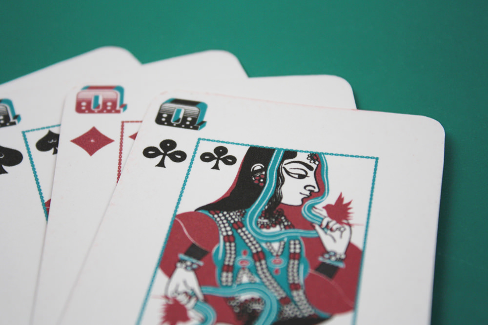 The design for the cards has been inspired by the Indian Truck Art Style. The lady with the lamp and the 3D treatment of the typography are some of the common features of the Indian Truck Art Style. Even the characters (king, queen, jack & joker) have been illustrated in the traditional Indian painting style to give the work an Indian feel. The printing method includes a mix of letterpress and inkjet printing. The front (characters and numbers) of the cards have been printed using an inkjet printer whereas the back and the packaging of the cards has been printed using the Letterpress technique.
