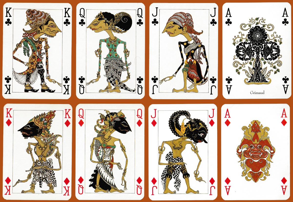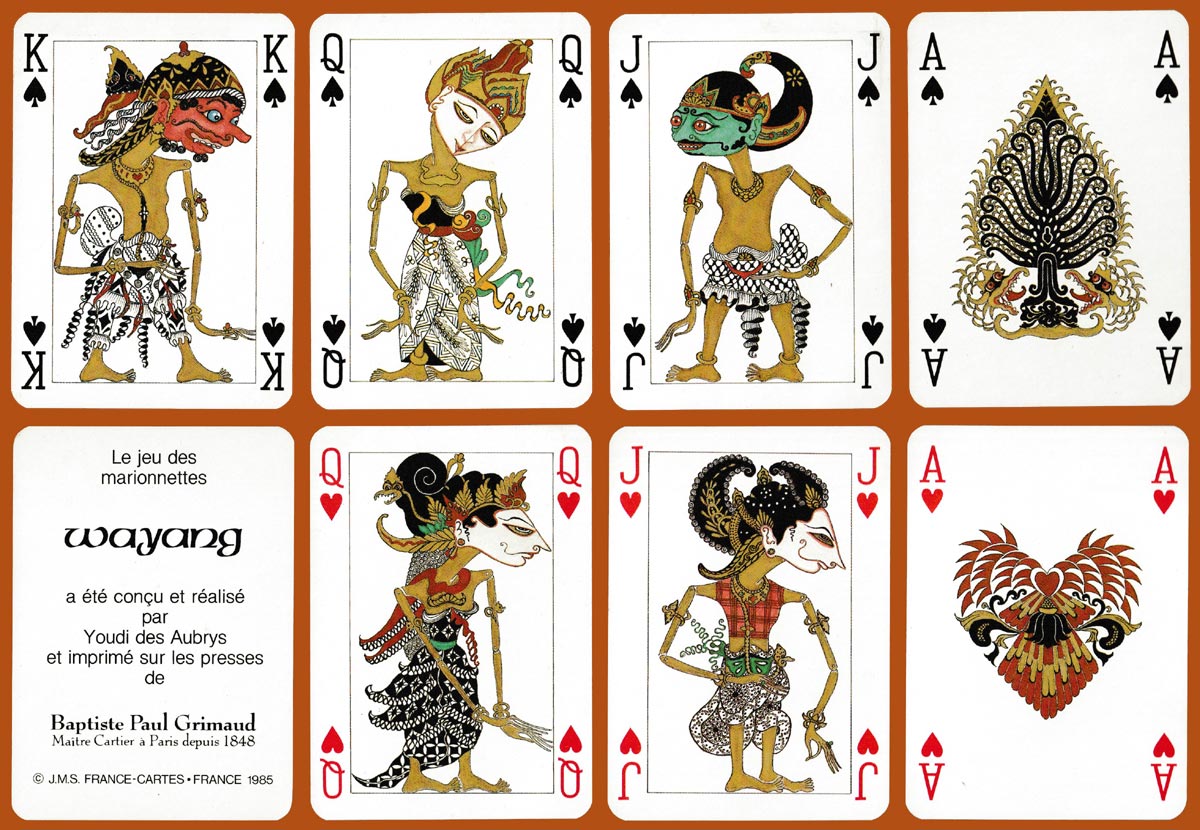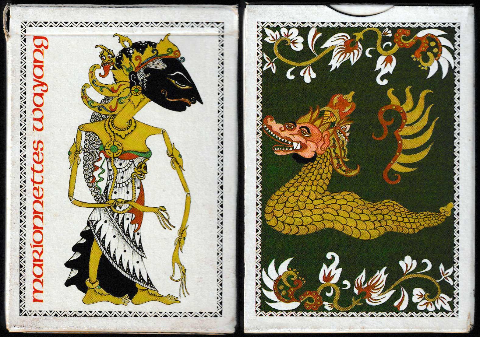 Above: Wayang marionette designs conceived by Youdi des Aubrys from Indonesia, printed by France Cartes, St Max, France, 1985. 52 cards + 2 Jokers + 1 title card in tuck box. Size: 63 x 88 mm.