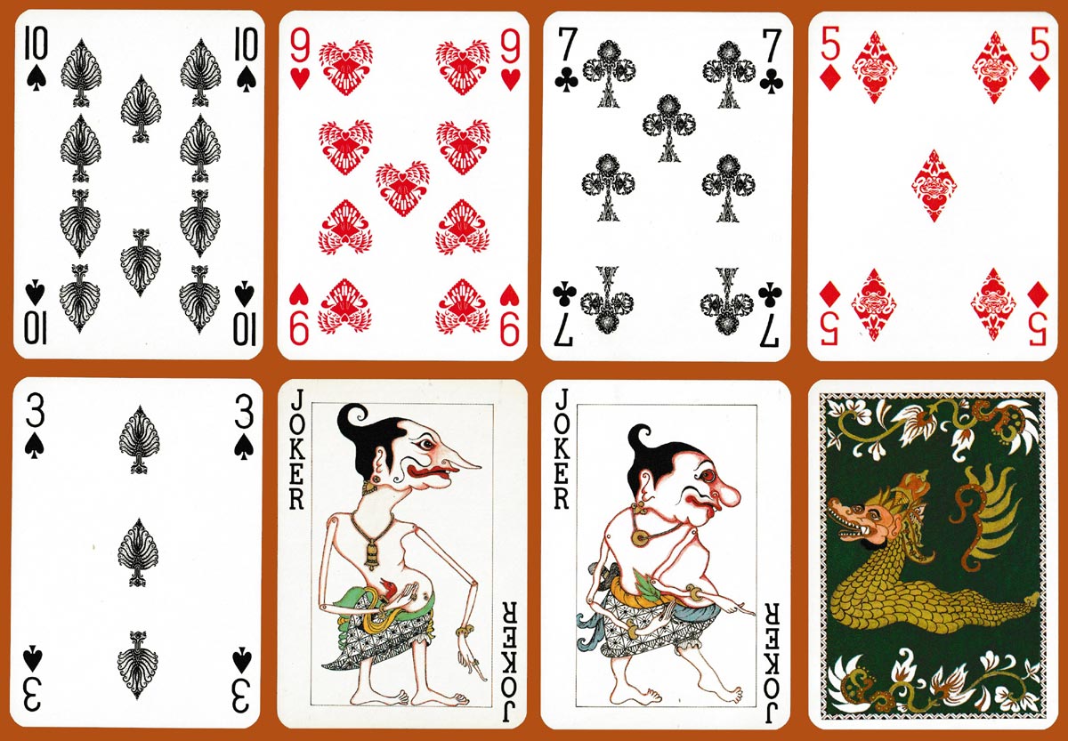 Wayang is a traditional form of puppet theatre entertainment which originated on the island of Java but which is also known in Bali and elsewhere. The name wayang can refer to the entire show or to the puppet itself. The strong, full-length designs in this pack were created by Youdi des Aubrys, an artist considered Dutch but who was born in Indonesia in 1928. As of June 2022, she was still alive, living and working between Menton and Nice. The characters depicted are not named. The Aces are elaborately decorated, with scaled-down, simplified versions of these suit-signs appearing on the pip cards. Shown here is one of two different back designs produced.