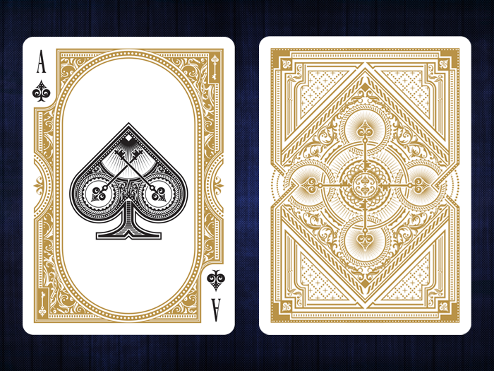 Instead of the usual ace of spades, or a seven of diamonds, this pack has a "spade of aces" and a "d...