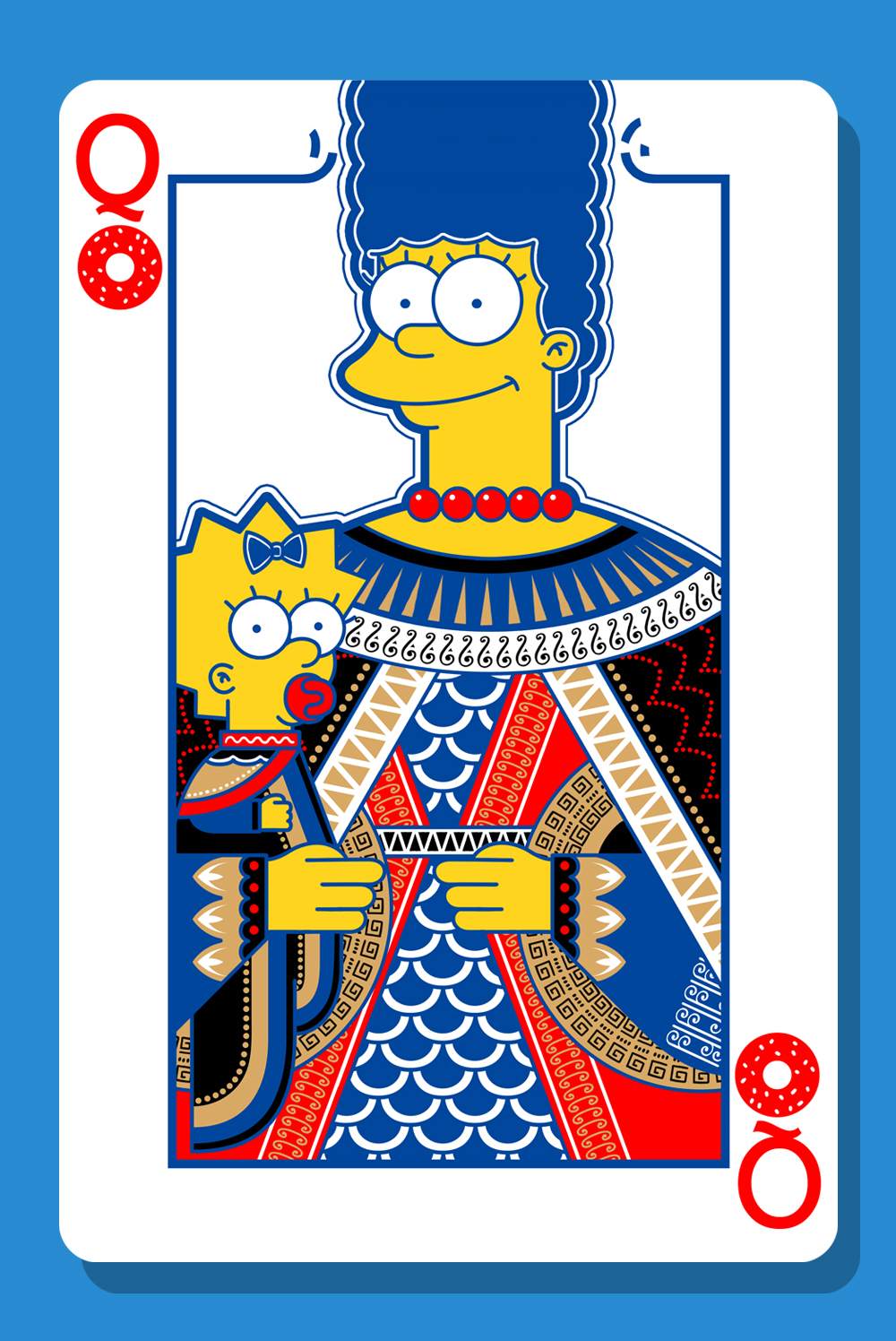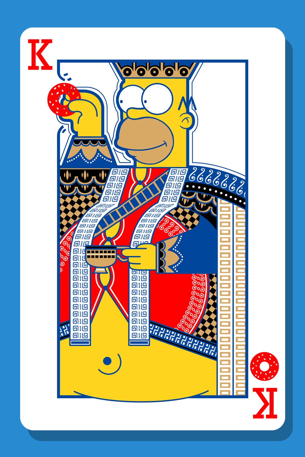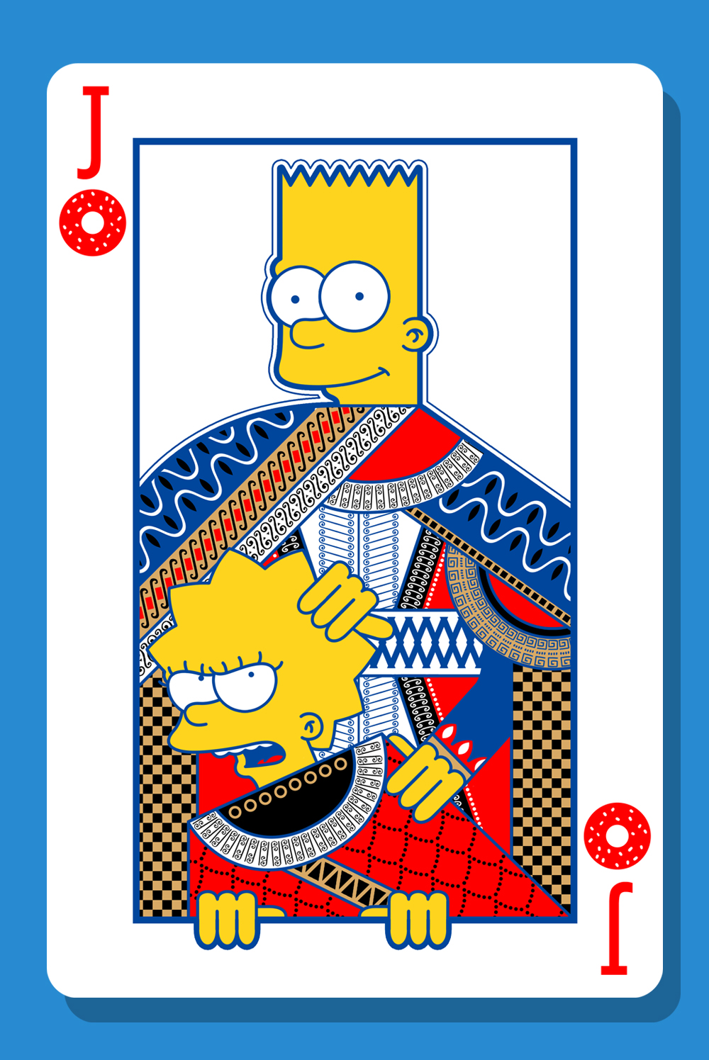 "Suddenly I got an ideas of combining playing card with the simpsons family. I thought that the Jack, Queen, and King can represent Simpsons as a family. So, Homer will be the king, Marge will be the Queen and she holding Maggie. Lisa and Bart will be the Jack.For the card's icon, I changed it into Doughnut because its Homer's favorite food."