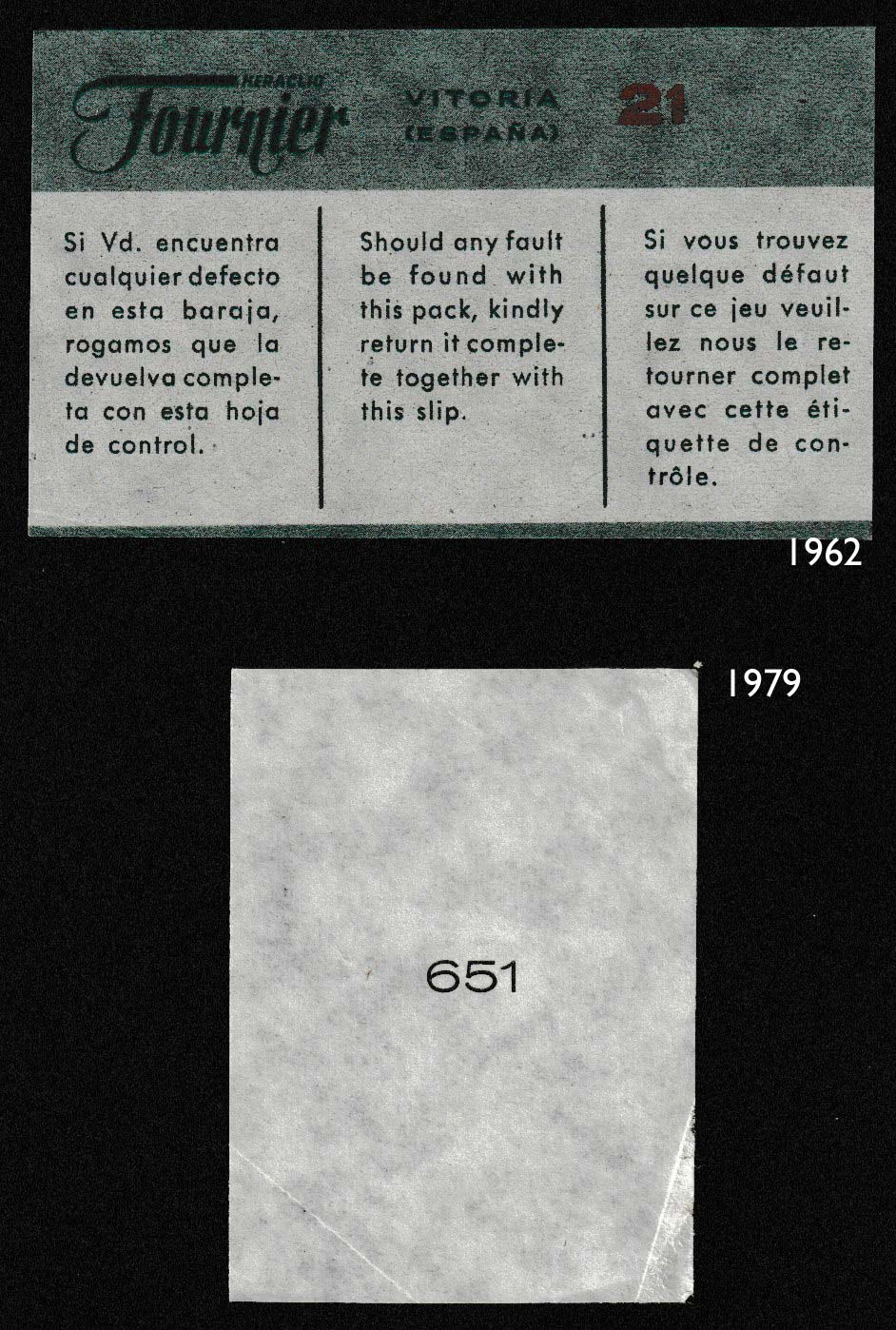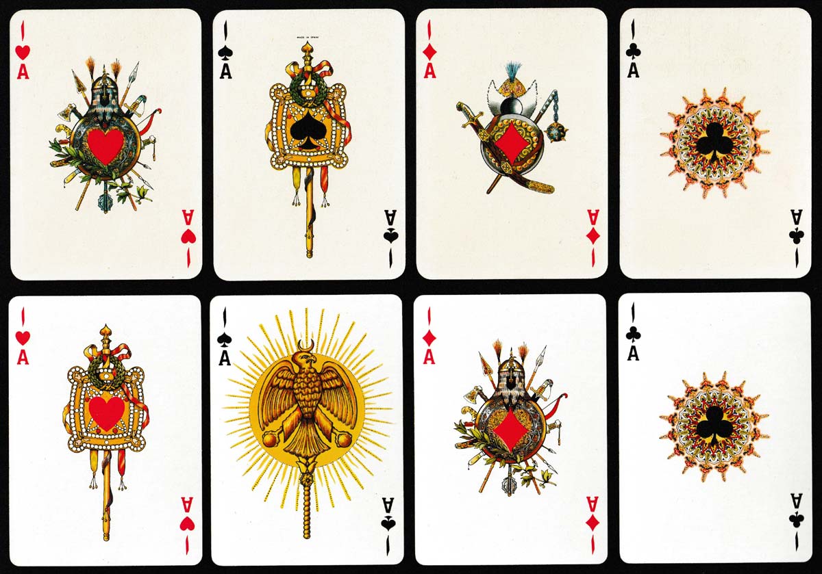The Hearts courts and Ace were switched to Diamonds; the Diamonds courts and Ace were dropped completely; the Spades courts and Ace were switched to Hearts; the Clubs courts and Ace remained the same. Totally new designs were introduced for the 1979 Spades courts and Ace. The 1962 pack was on slightly creamier card than the 1979 one. The corners were more rounded and had more gilding than on the later pack. The 1962 pack lies flat, whereas the 1979 pack has a tendency to curve slightly over time. On the 1962 AS, one can read "MADE IN SPAIN" just above the design, whereas this is absent from the 1979 AH. On the 4C, the number '419' has been added at the foot of the design in the 1979 reprint. The back design remained the same (mine is red). Lastly, the design of the packing/control slip changed from an elaborate to a simple one - R.S.