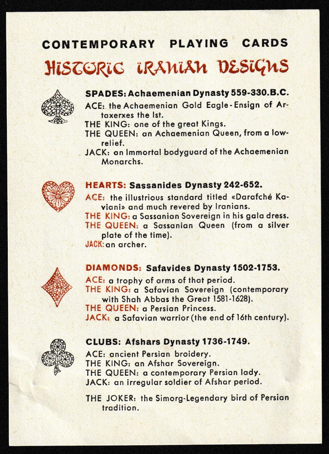 Representing Iranian culture and history and intended for a Persian market, these playing cards were designed by V. Romanowski de Boncza. The deck was commissioned by the Royal Iranian Government Playing Card Monopoly (Ministry of Finance) at the time and printed by De la Rue & Co., Ltd, c.1937. The double-ended court figures are wearing exotic Persian costumes from different dynasties.