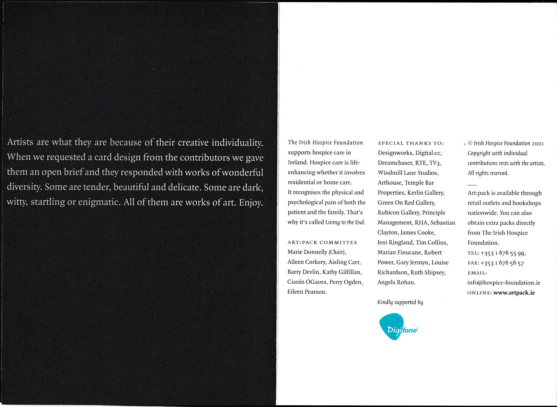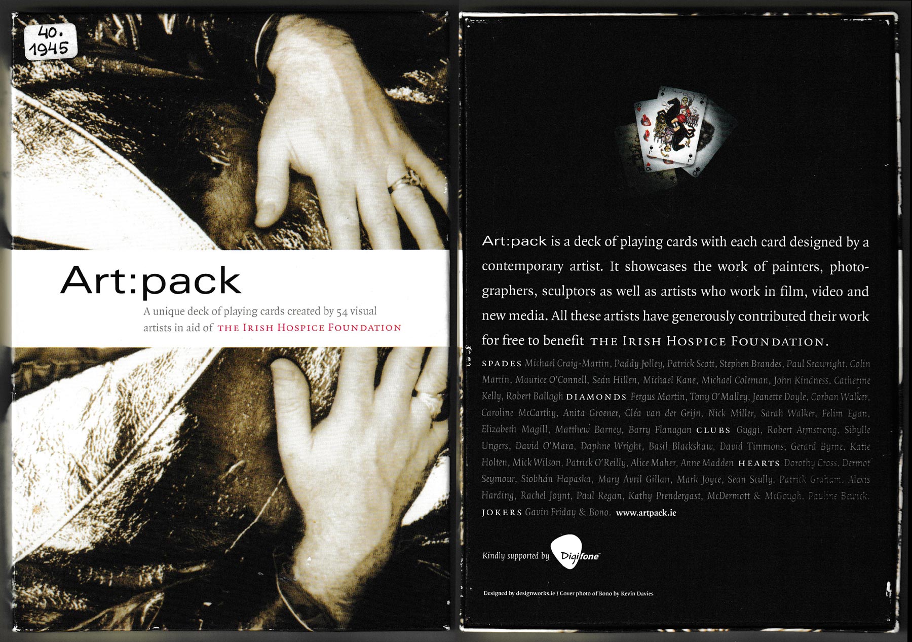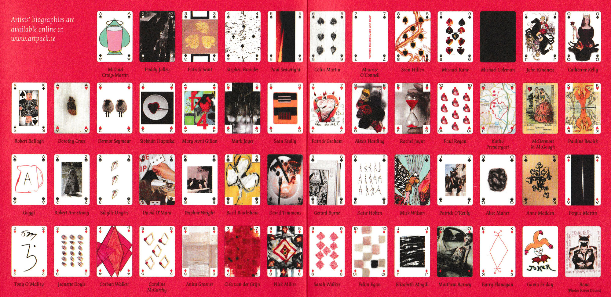 A special deck of cards was used to raise awareness of the Irish Hospice Foundation. The Art:pack features 52 custom-made cards by a variety of visual artists such as Robert Ballagh, Basil Blackshaw, Felim Egan, Guggi, Anne Madden, Patrick Scott and Sean Scully. Gavin Friday and Bono will feature as the jokers. See the box►