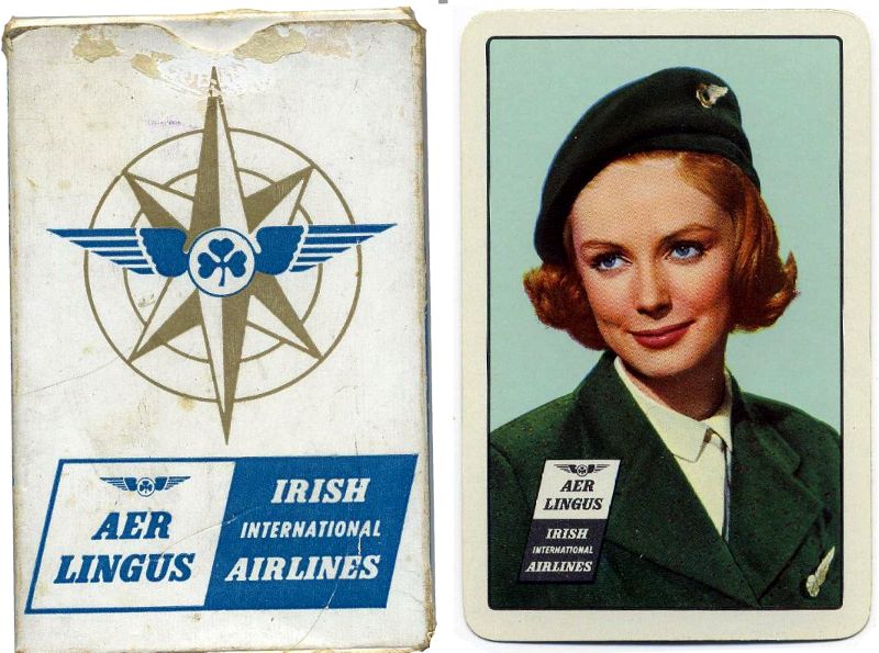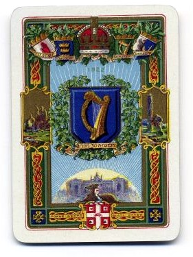 Above: a) Commemorating the establishment of the Irish Free State by treaty with England in December 1921, design by Edward Cunningham of Goodall & Son, 1922.   b) Aer Lingus compliments pack.   c) Joker from Irish Souvenir deck.   d) Joker from Irish ‘Heroic’ set, 1919.   e-f) 2 cards from Irish ‘Historic’ set, c.1920.