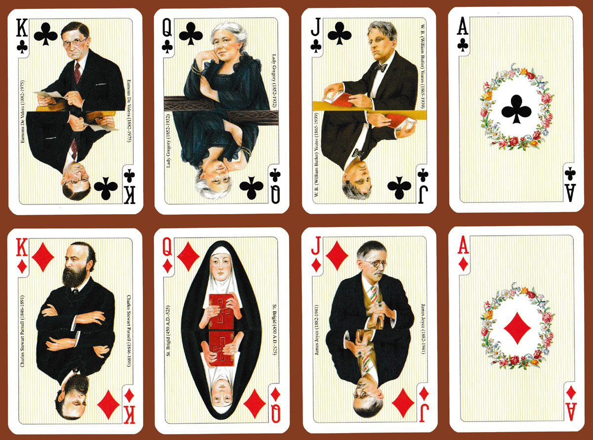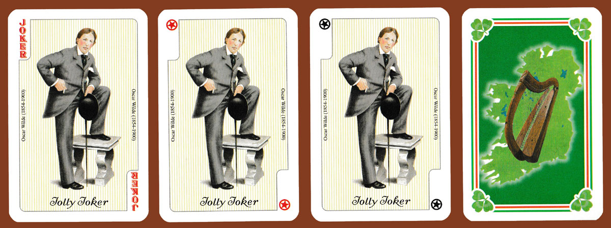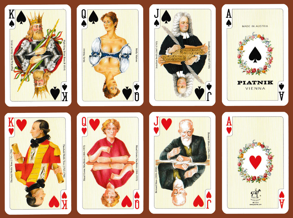 The personalities chosen to appear on this pack are certainly diverse, including Ireland’s most famous king, Brian Boru, and the third president, Eamonn De Valera, on the Kings, Molly Malone (the main character in the Irish folk song “Cockles and Mussels”) as one of the Queens, and Bernard Shaw, James Joyce, Jonathan Swift and W.B. Yeats (misspelt ‘Yeates’) on the Jacks. Oscar Wilde is depicted on the Jokers. The back design features a harp superimposed on a map of Ireland against either a green or a blue background, with a shamrock in each of the four corners. The overall style is very similar to that of other non-standard bridge sets from Piatnik. Piatnik No. 214745.