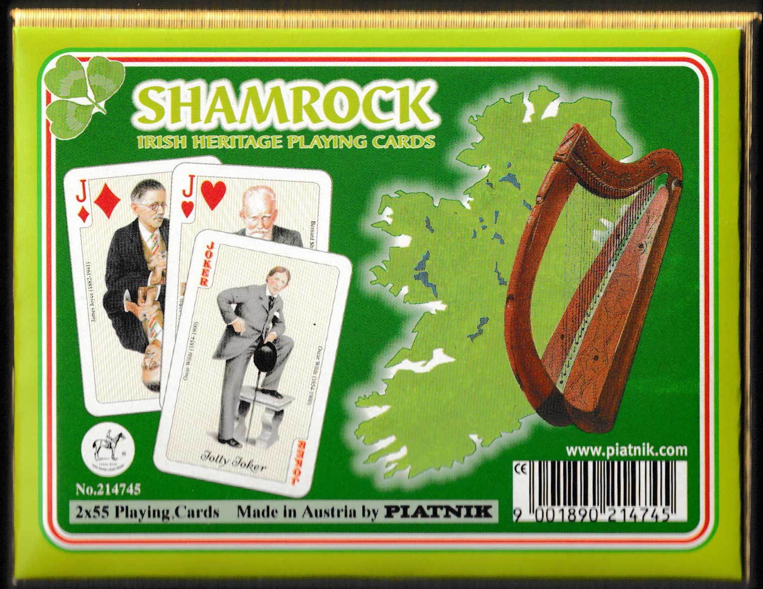 Above: Shamrock Irish Heritage playing cards made by Piatnik, Vienna, Austria, 1999. 2 x 52 cards + 3 Jokers in drop-lid box. Size: 58.5 x 89 mm.