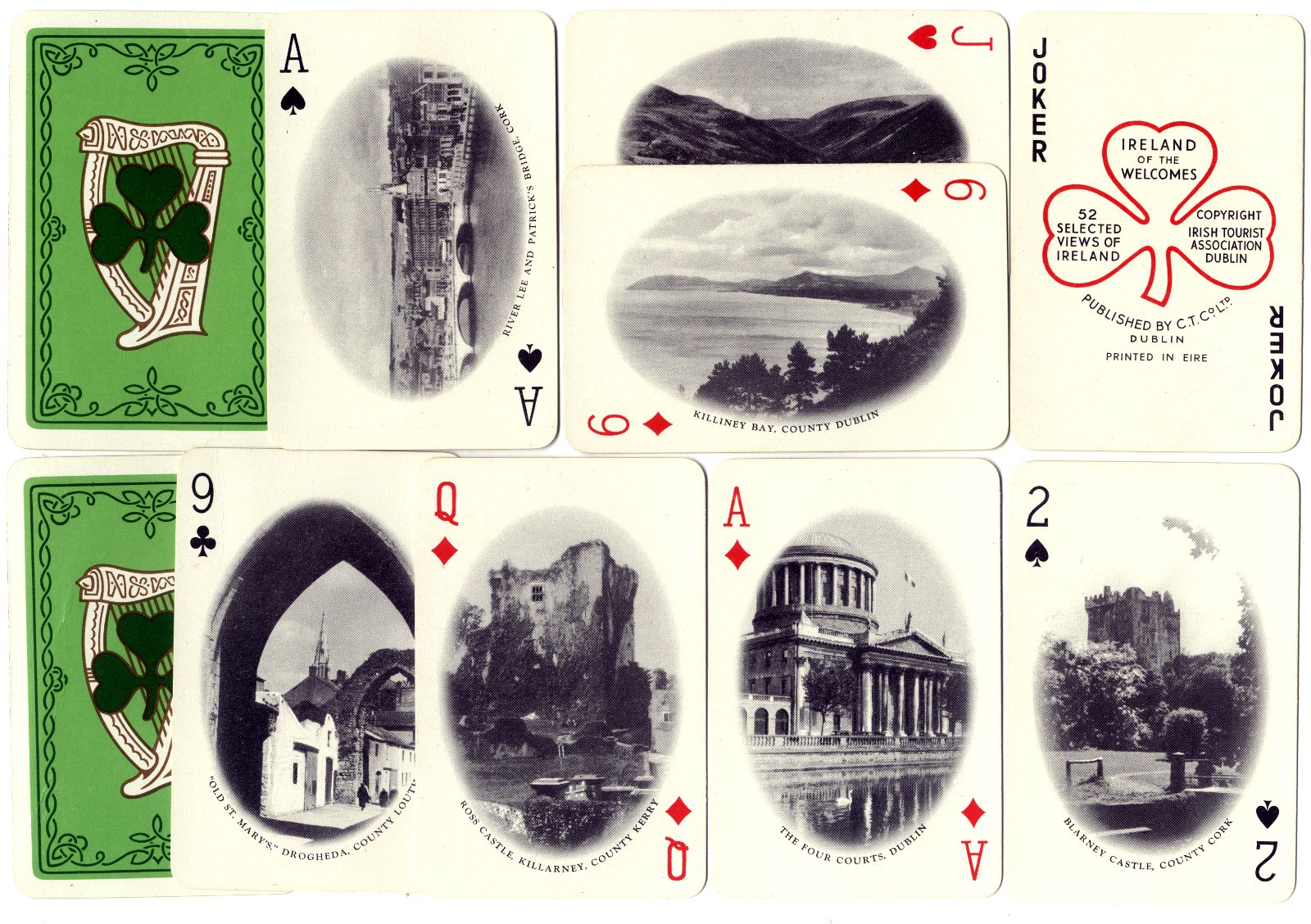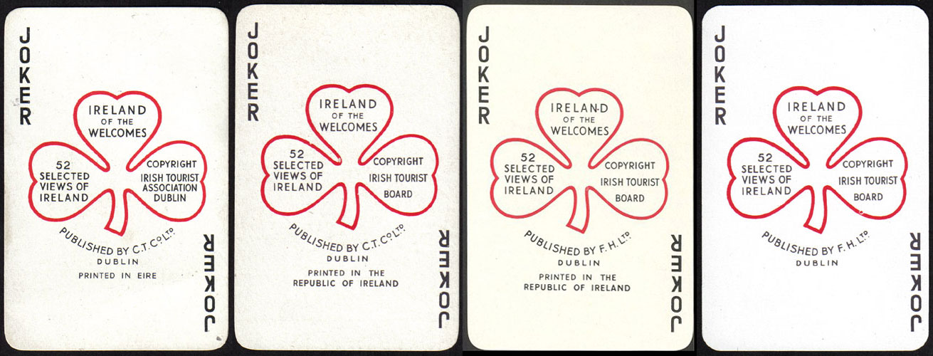 Above: Selected views of Ireland Souvenir playing cards published by the Irish Tourist Association, C. T. Co. Ltd, Dublin, whose details are printed on the Joker card, early 1950s