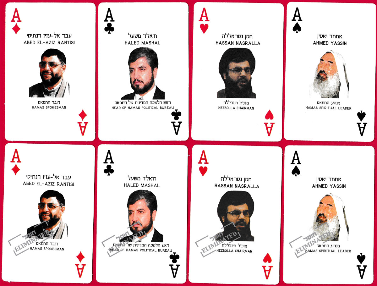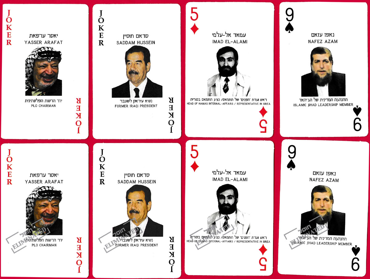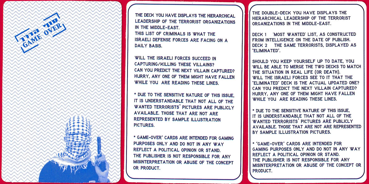 This offering from Israel presents two packs of identical cards. The first is titled “Most Wanted” and the second “Eliminated”. Both packs display the same photos of individuals deemed by Israel to be leaders of terrorist organisations in the Middle East. Those whose photo is not publicly available are represented by sample illustration pictures. However, the second pack displays the same photos with one major difference: those that have been killed are stamped with the word “Eliminated”. The two jokers are Saddam Hussein and Yasser Arafat. Somewhat ironically, the extra card informs users that the cards are “intended for gaming purposes only and do not in any way reflect a political opinion or stand”. See the boxes►