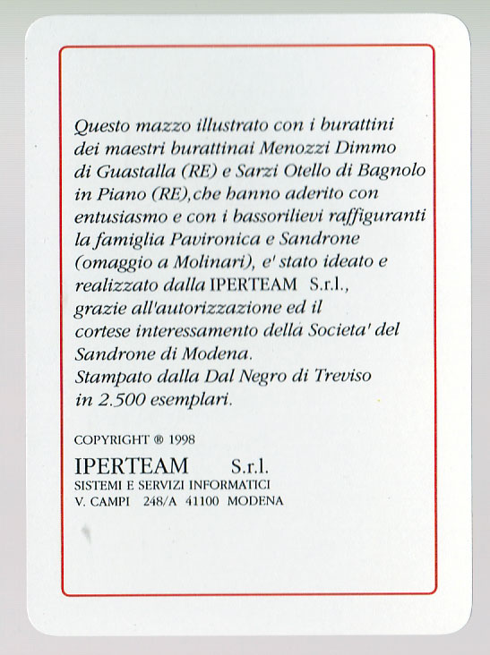 Above: Baracca & Burattini puppetry deck, sponsored by La Società del Sandrone, produced by Iperteam Software Services (Modena) and printed by Dal Negro, 1998. 52 cards + 2 Jokers + extra card in box, 2500 copies.