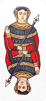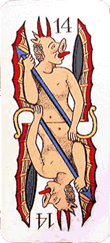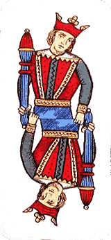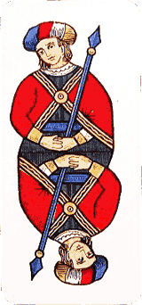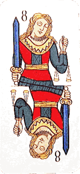 This pattern has origins in the late XV century and was the earliest tarot pack to be converted to double-ended format. The deck is shortened to only 62 cards by omitting the lower numeral cards 2-5 in each suit.