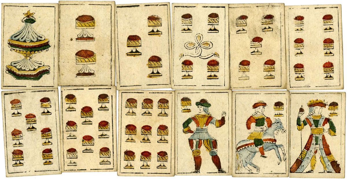 Above: cards manufactured by Pedro Bosio, Genova (Italy) during the 18th century and probably for export to Spain, the Philippines or South America. The Ace of Coins has the arms of Spain. The design corresponds closely to the Spanish National pattern, and specifically to the variant known as the Money Bag type owing to the Jack of Coins holding a money bag (top row). The cavalier of cups lacks the usual inscription of Ahí Va. The cards are printed from woodblocks and hand-coloured using stencils. The backs are decorated with a pattern of ermine spots in black.