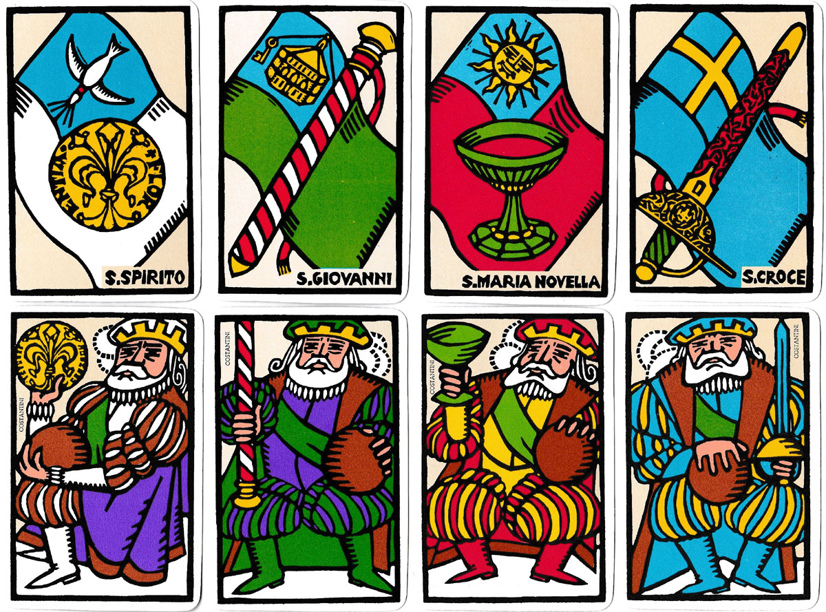 Today, three matches are played each year in Piazza Santa Croce in Florence in the third week of June. A team from the four quarters of the city is represented – each of which are represented in the pack: swords -- Santa Croce / Azzurri (Blues); cups -- Santa Maria Novella / Rossi (Reds); coins -- Santo Spirito / Bianchi (Whites); batons --San Giovanni / Verdi (Greens). The appropriate coloured team banner is shown on the ace of each suit.