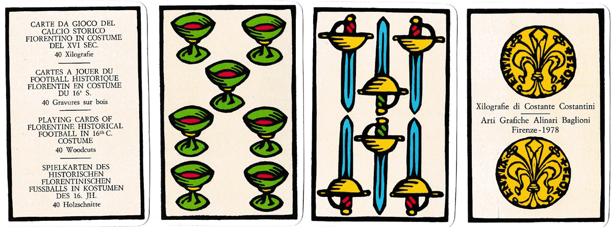 Above: ‘Calcio Storico Fiorentino’ playng cards produced from woodcuts by Costante Costantini, with artwork by Alinari Baglioni, 1978.