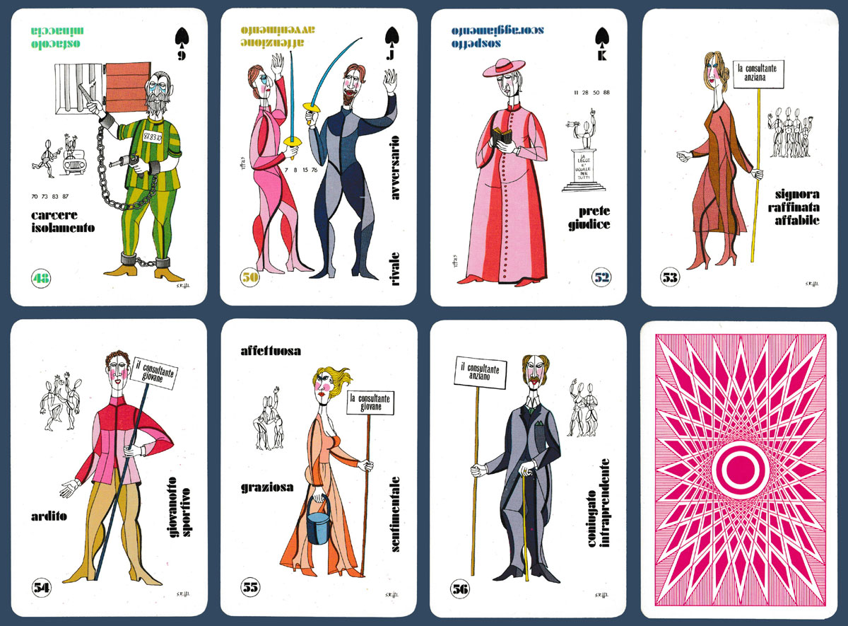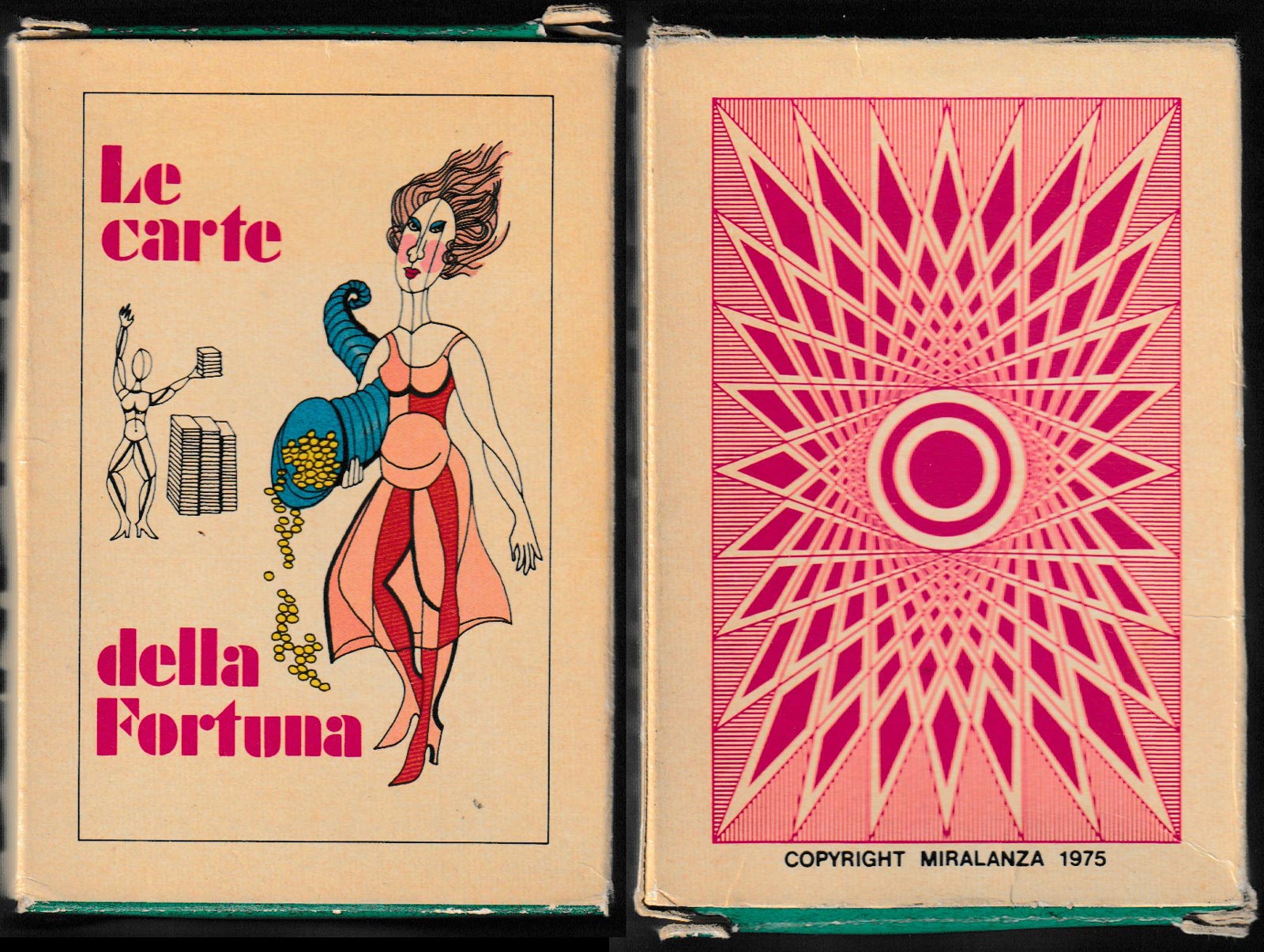 Above: Le carte della Fortuna designed by Sergio Ruffolo. Published by Il Nuovo Torcoliere for Miralanza, Italy, 1975. Printer unknown. 52 cards + 4 “consultant” cards + 32-page booklet in Italian, in tuck box. Size: 62 x 94 mm. Copyright Miralanza 1975.