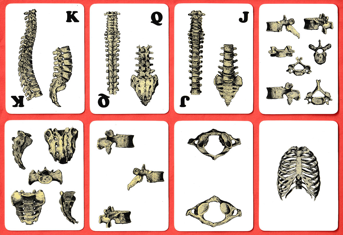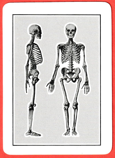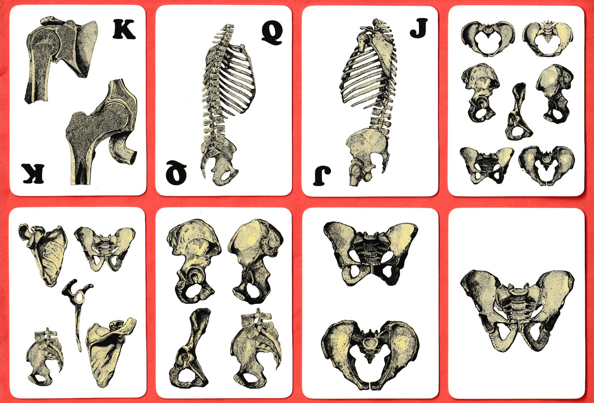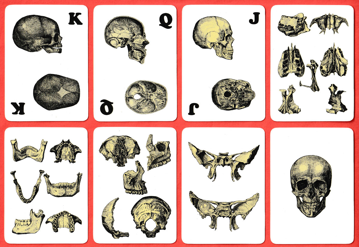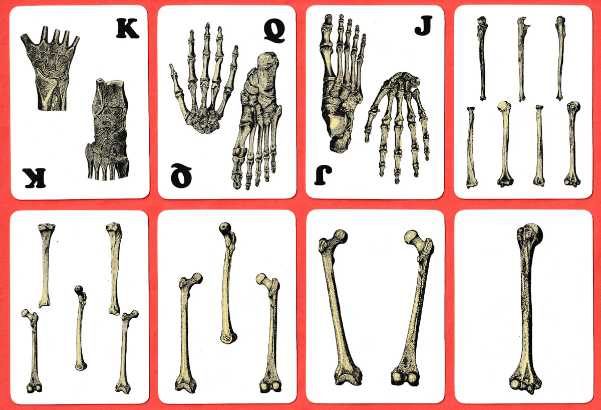 The four suits are skull skeletons, axial skeletons, attachment belt skeletons, and appendicular skeletons. The only indices are on the court cards (K, Q, J); otherwise, one has to count the bones. The booklet also includes rules for a variant of the Italian game of scopa.