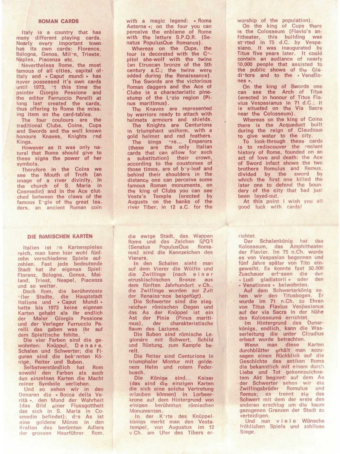 Carte Romane were designed by Giorgio Pessione for Capitol Carta Roma, 1973. The publishers were aiming to establish “Carte Romane” as a distinctive regional pattern for Rome, the most famous of all cities, capital of Italy, which up to that time was missing from card tables. The deck celebrates the ancient history of Rome, founded on an act of love and death... See the Leaflet►