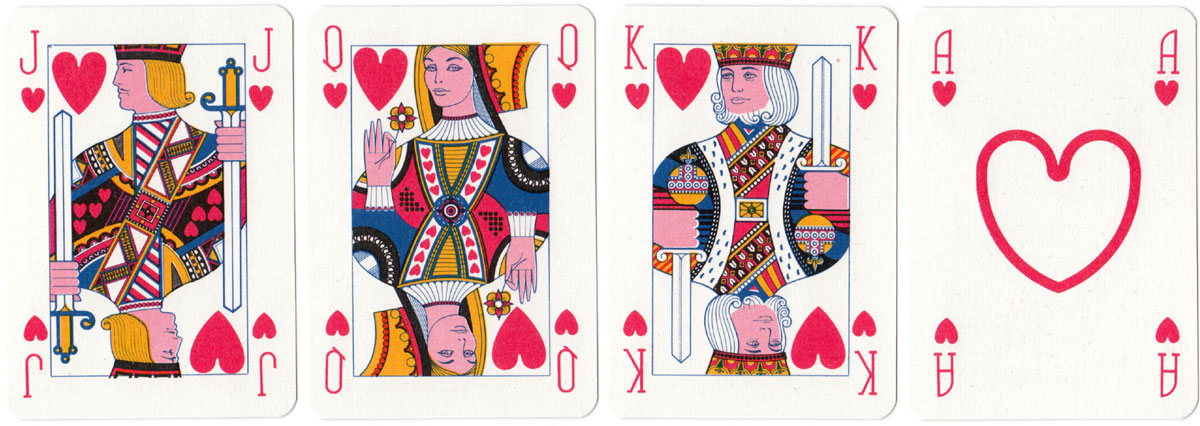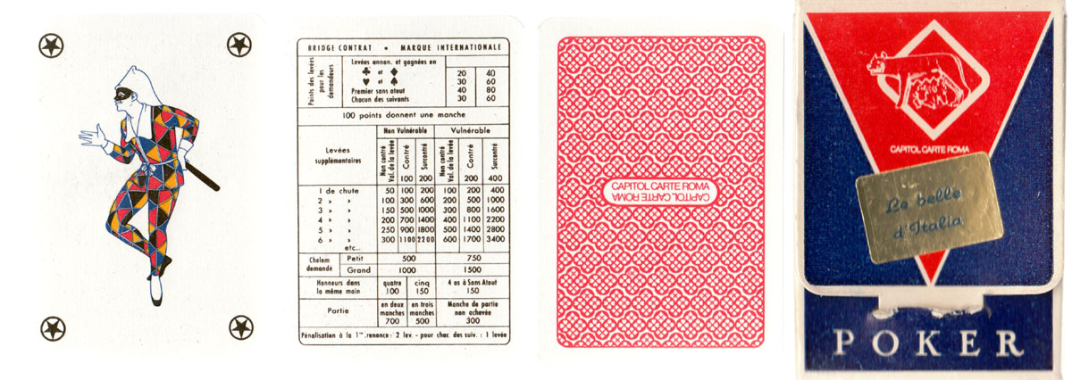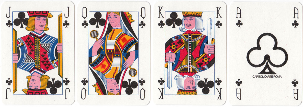 Above: international Poker deck produced by Capitol Carte Romaan, c.1973, featuring original designs with a lot of non-standard features.