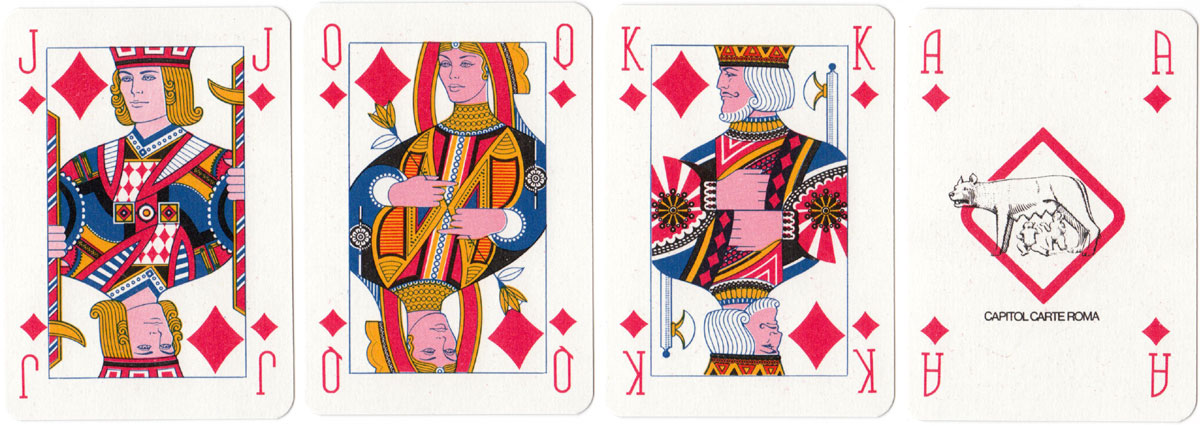 An international Poker deck was also produced by Capitol Carte Roma showing Romulus and his twin brother Remus, founders of the city of Rome, on the ace of diamonds.