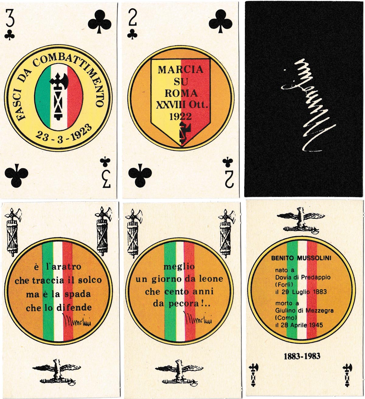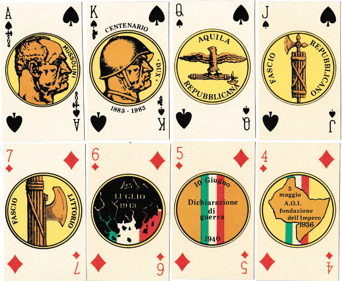 Above: playing cards to commemorate the centenary of Benito Mussolini's birth by Edizione Il Meneghello, Italy, c.1983. 40 cards, limited edition of 1200 packs.