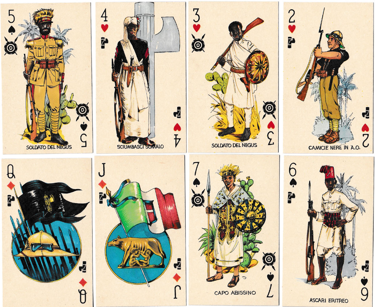 There are 40 cards in the pack, ace-seven, and jack, queen, king. The figures on the pip cards and courts are repeated on each suit, while the aces portray H.M. Vittorio Emanuele III, King of Italy from 1900-1946, and self-proclaimed Emperor of Ethiopia from 1936-1941, Haile Selasssie (Emperor of Ethiopia from 1930 to 1974), Rodolfo Graziani (Viceroy of Italian East Africa) and, on the ace of hearts, a shield with crossed spears with a feathered crown above. The pip cards portray Ethiopian soldiers, an Abyssinian chieftain, sergeants from the Royal Corps of Eritrean Colonial Troops, Blackshirts from the Voluntary Militia for National Security.