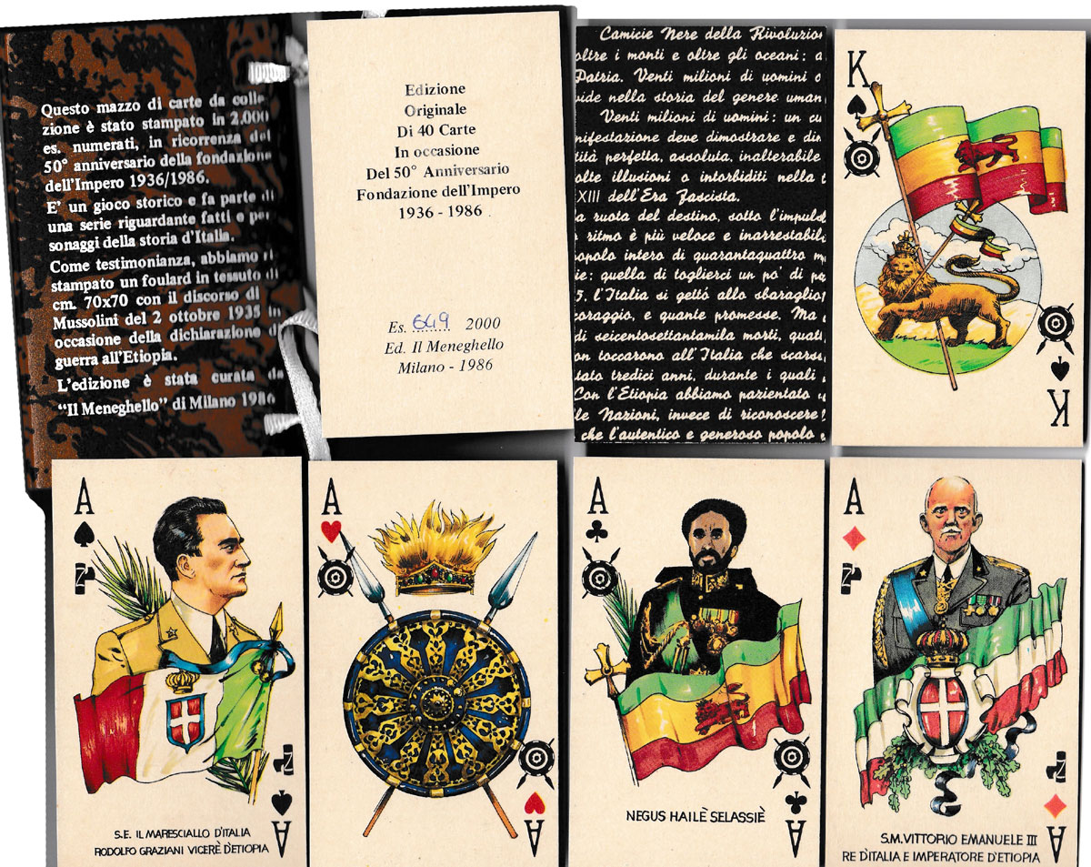Above: ‘Cinquantenario Fondazione dell'Impero’ playing cards published by Edizone Il Meneghello, 1986. The cards have square corners and measure 10 x 6 cm, limited edition of 2000.