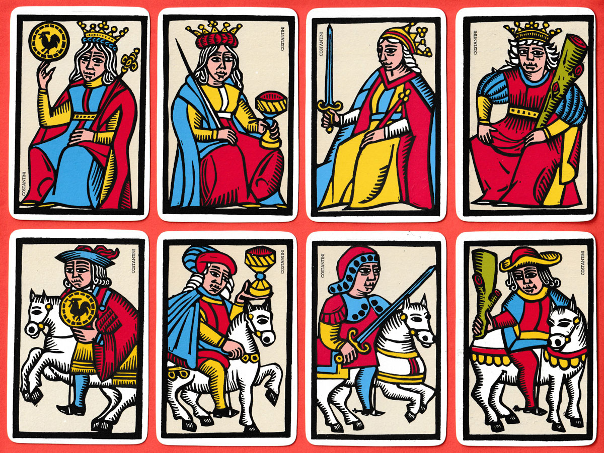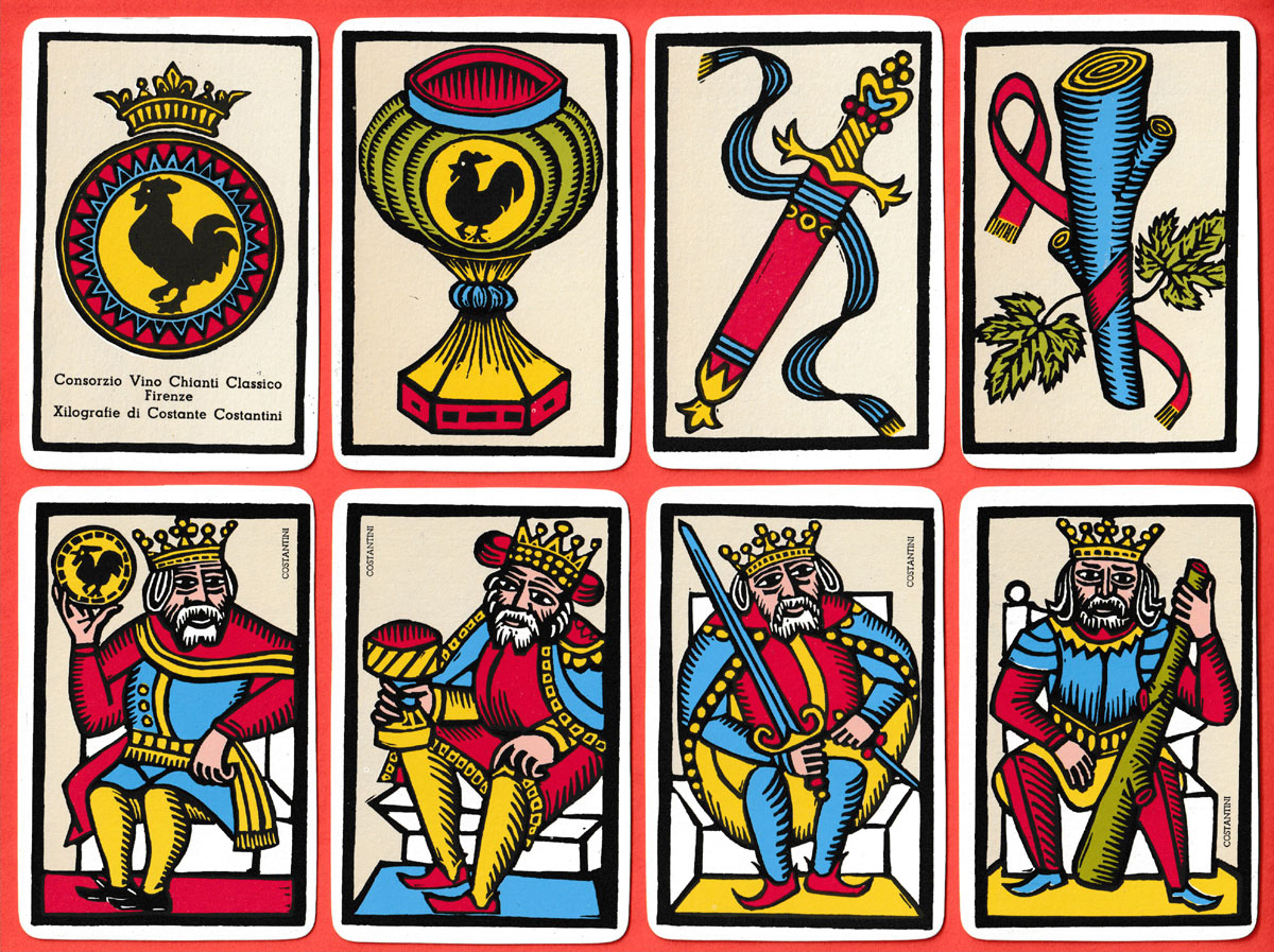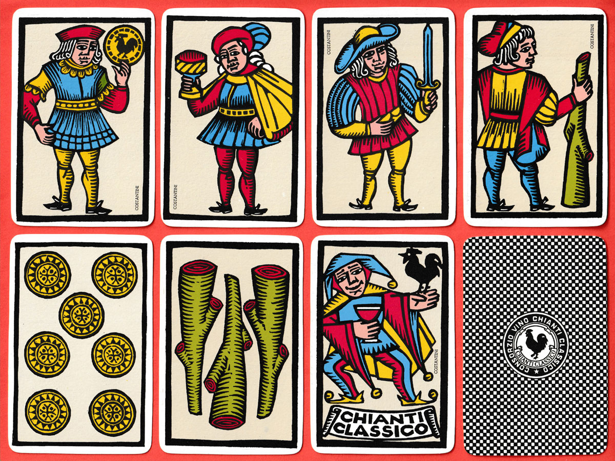 Bold use of primary colours, plus touches of green, combined with strong black outlines are the trademark of the artist, Costante Costantini, who went on to design several more packs after this one. The gallo nero, the symbol of the Chianti Classico wine consortium for whom this pack was produced, is featured prominently, notably on the Ace of Coins, the Ace of Cups and the Joker. The artist’s name is included on all the court cards, the Ace of Coins and the Joker. Although most Italian-suited packs contain 40 cards, this one has 44, there being both a Cavalier and a Queen in each suit, allowing the possibility of playing with either one of them. The logo of the Chianti Classico wine consortium appears on the back and stamped on the lid of the box►