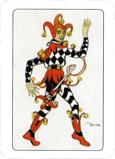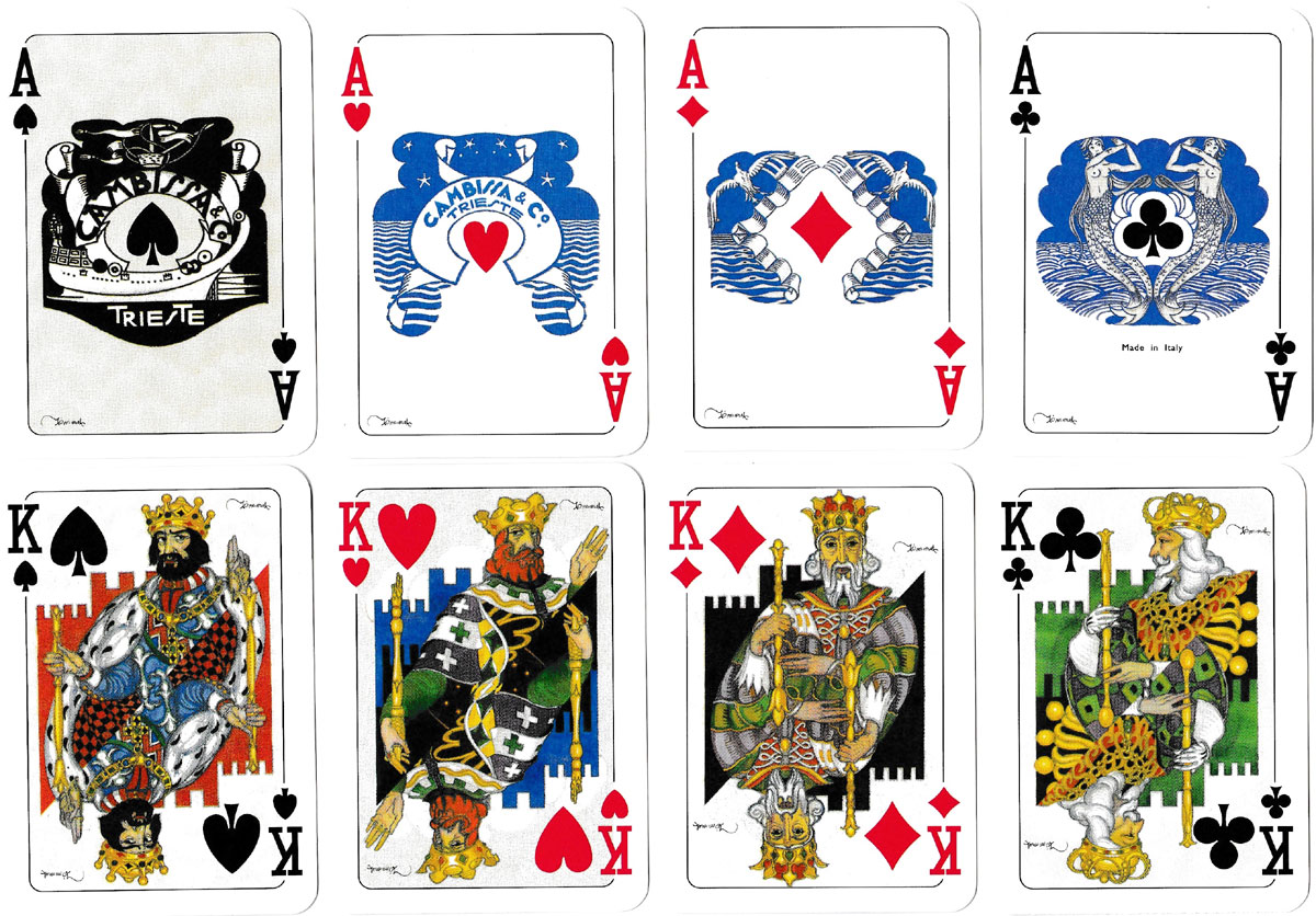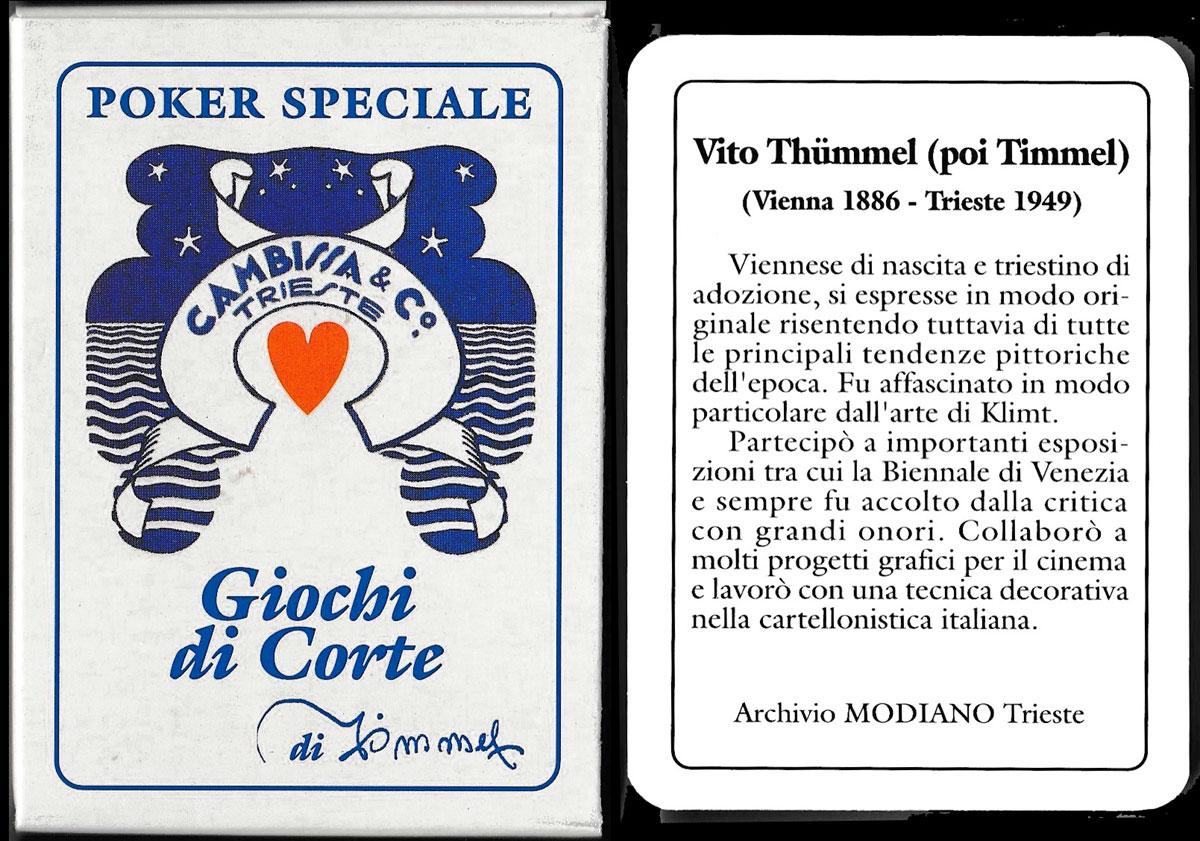 This pack entitled Giochi di Corte or “Court games” was published by Cambissa of Trieste in 1991. The design/artwork for this colourful and striking pack was by Vito Thümmel (known as Timmel). He was born in Vienna in 1886, but moved to Trieste in 1890, and died there in 1949. Thümmel participated in various exhibitions including the Venice Biennale. He was also a graphic designer for the movie industry and involved in the advertising market, specifically for giant posters.